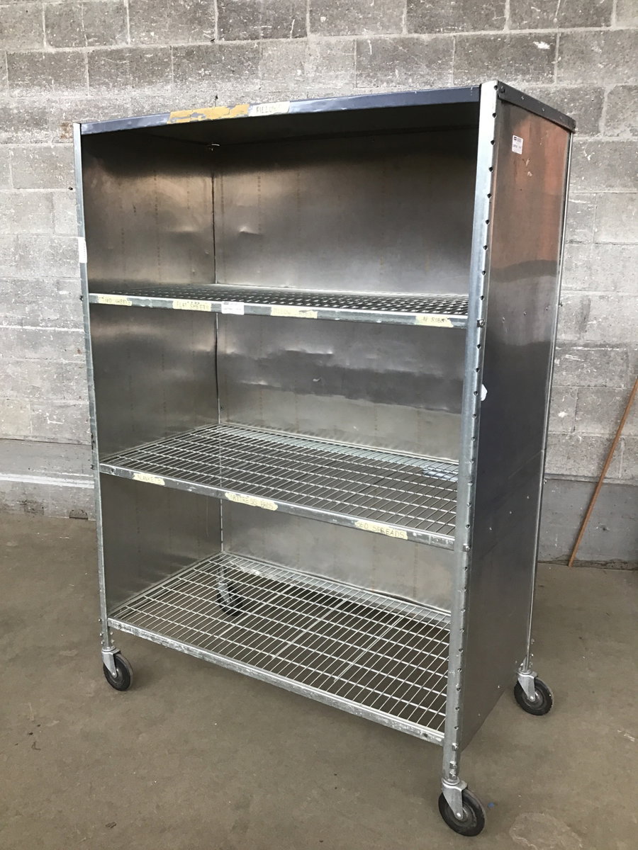 Rolling linen cart with three metro style shelves surrounded by aluminum on three sides. Open front, all four casters swivel. Doesn't seem quite as heavy duty as a Metro rack, butit would move some lightish bulky items really well. Dimensions are approximate.