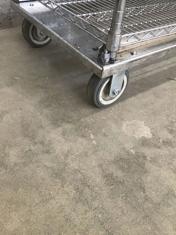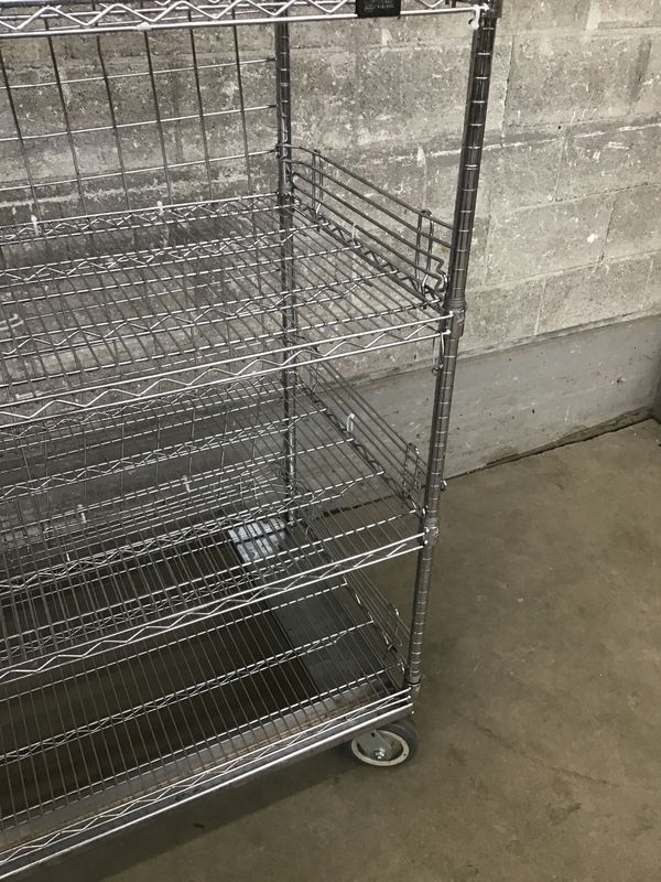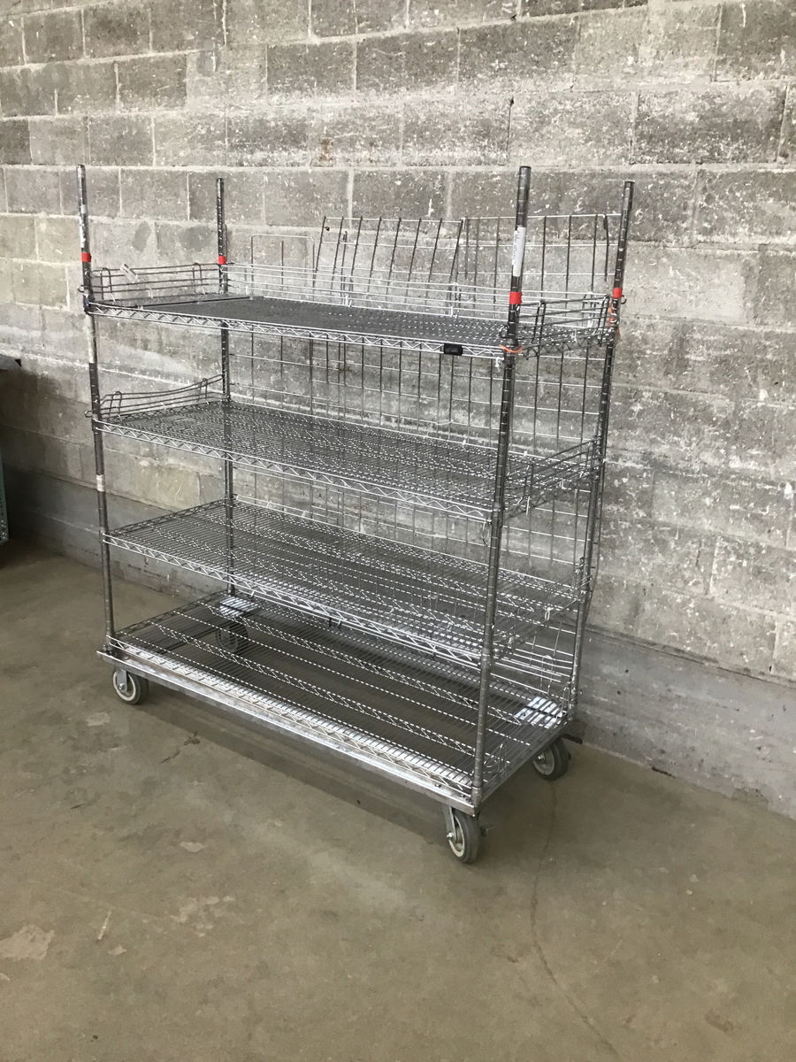 Rolling Metro style wire shelving rack with a wire back and short side guards to keep things from falling off. This one has a heavier base and casters than most. Two casters swivel, and two are fixed.