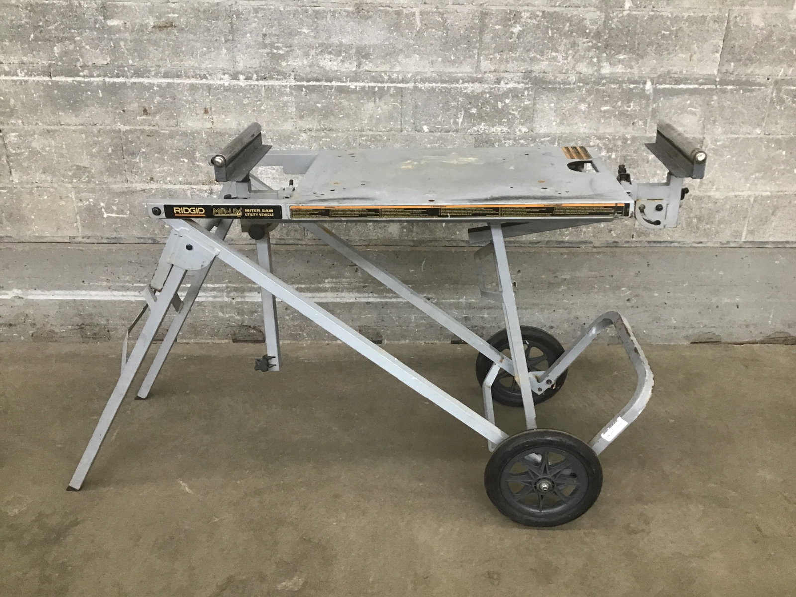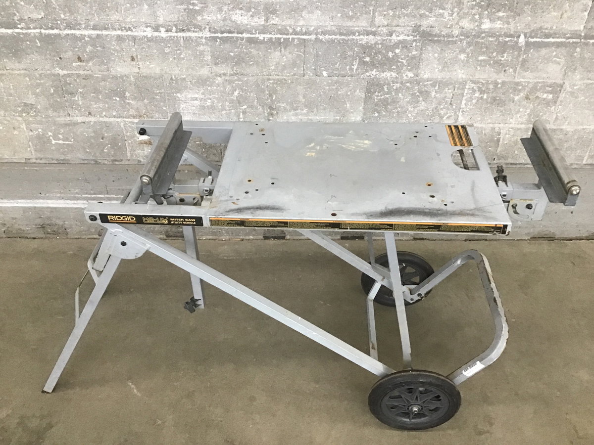 Portable miter saw stand made by Ridgid, Model MS-US (miter saw utility vehicle) with telescoping outfeed rollers. Dimensions are approximate.