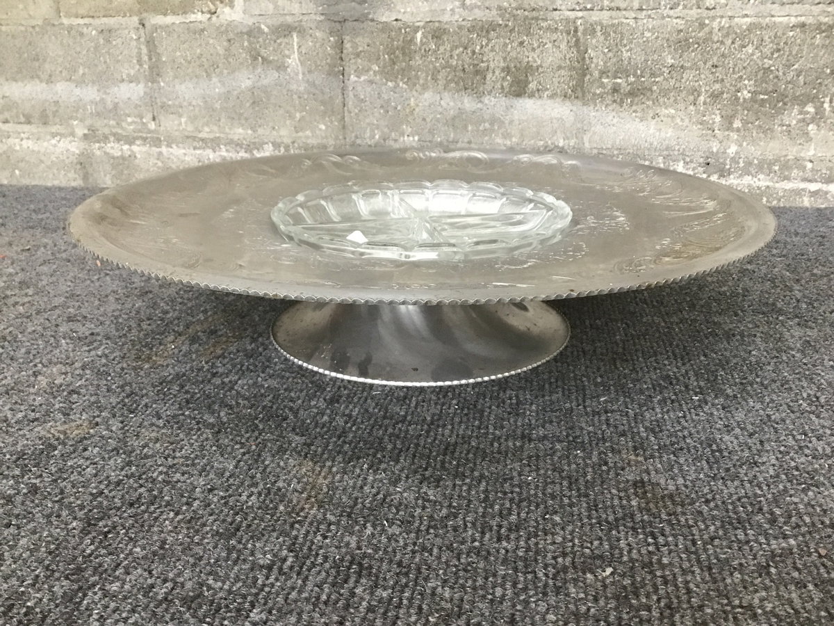 Ornate aluminum rotating tray with glass inset. Great for veggies and dip, or chips/crackers, etc.