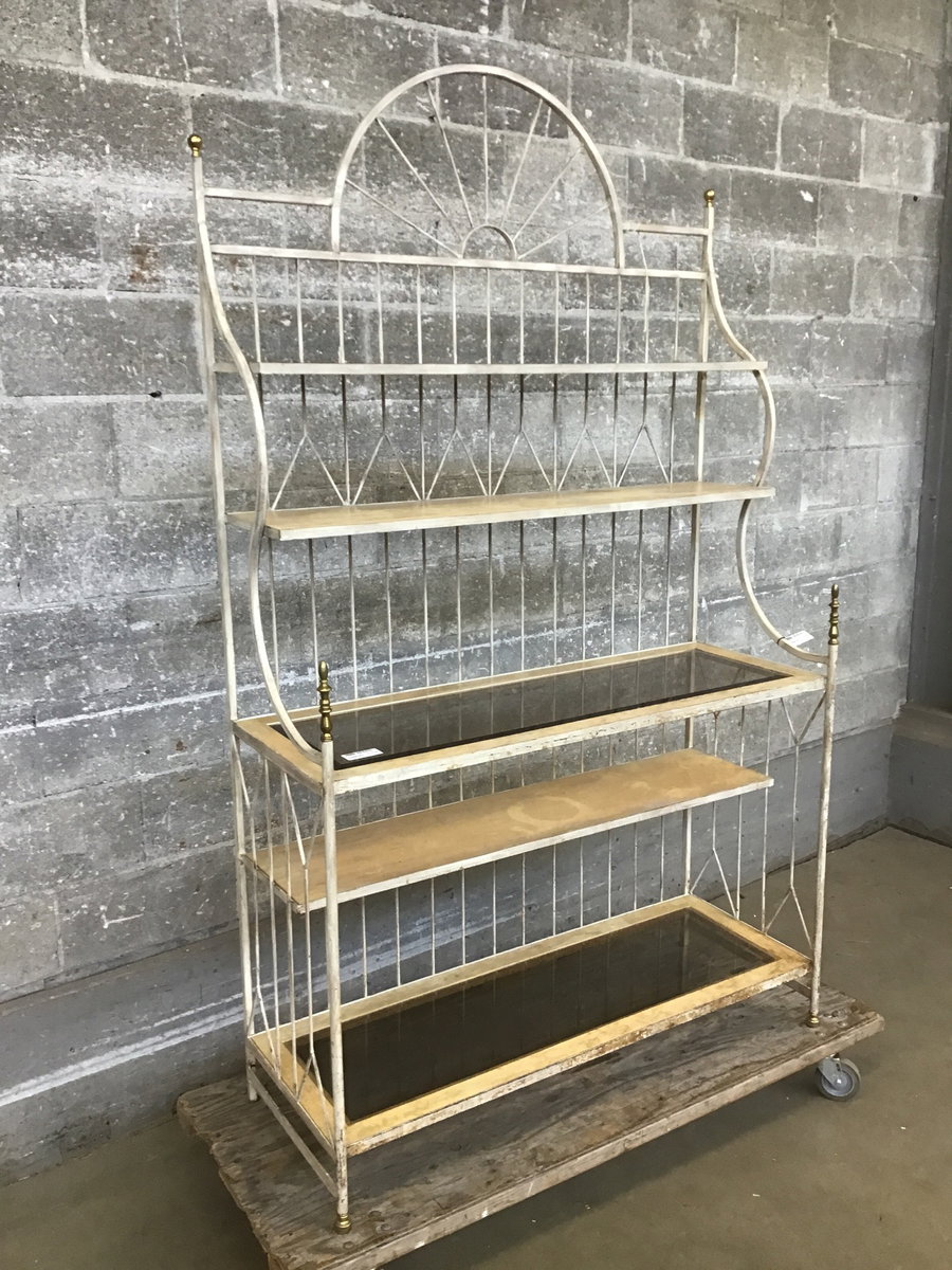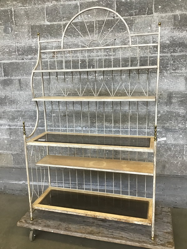 A very unique piece indeed! This rustic deco shelf features a plethora of design flairs and fancies. The swooping curves contrast well with the angular frame, making rigidity feel steadfast and stylish. A total of 5 tiers of shelving space, two of which feature prismatic smokey beveled glass leaves. This would look grand in a home that appreciates a pastoral twist on the roaring 20s.