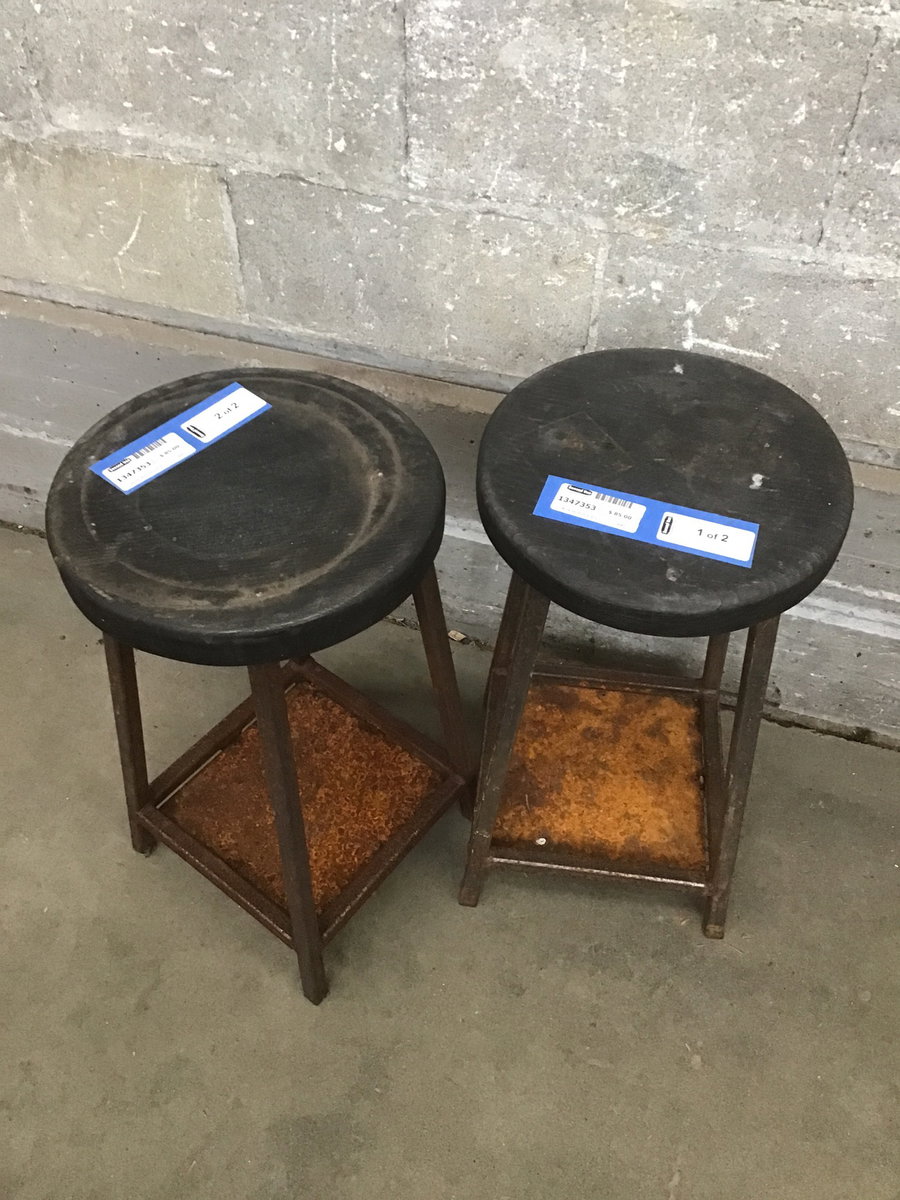 A pair of short and cute little stools with a black wood seat and a weathered and patina'd steel base, manufactured by UK-based designer Paul Frampton. Perfect for summer hangouts around the fire, a plant stand for your apartment balcony, or for exactly what they're intended to be!
