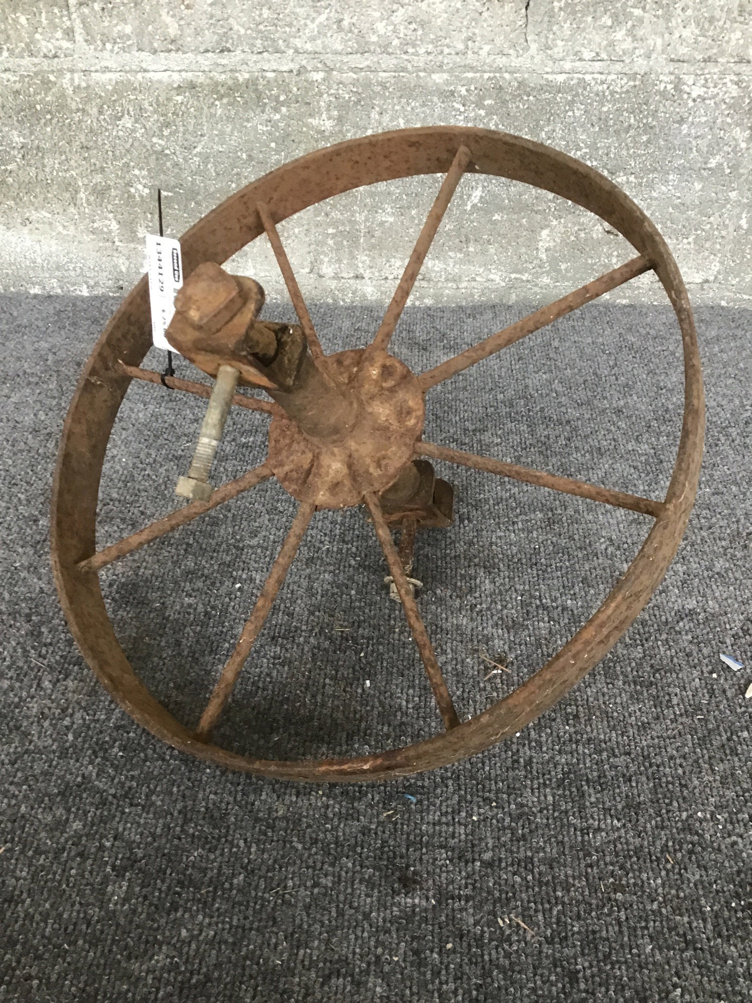 This is an old rusty wheel made from steel. Unsure of it's origin but could be a cool piece of yard art!