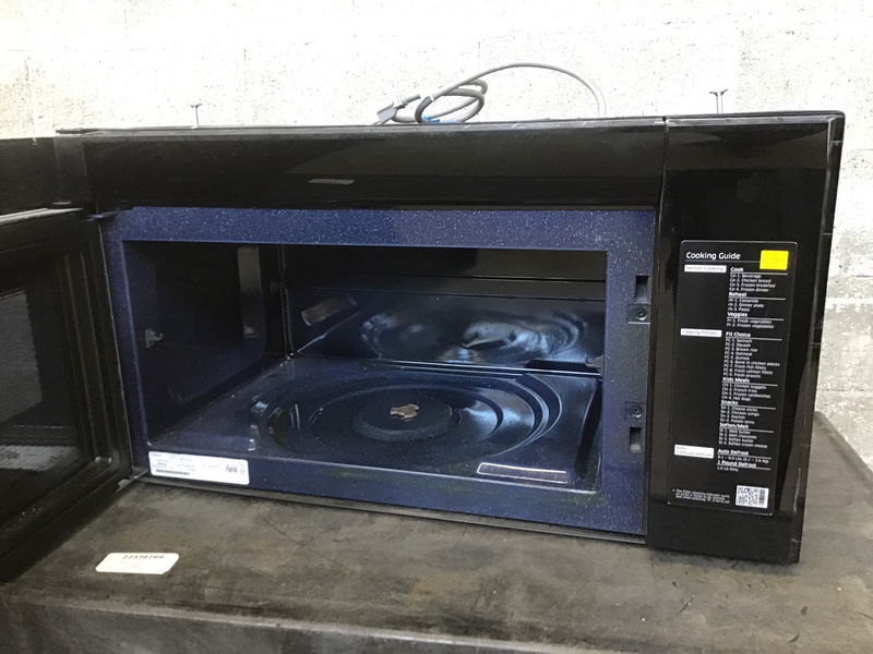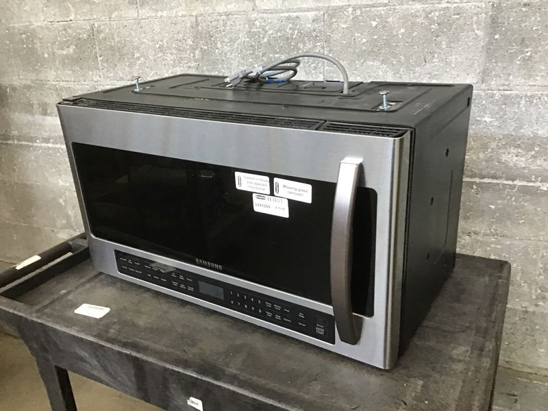 2020 Samsung over range microwave with a blue ceramic interior and stainless steel face. This is in excellent condition and looks like it's been barely used. This model retails for around $400. Your price on this unit reflects a missing glass carousel. Yes, we've greatly reduced the price on this excellent microwave because we don't have any carousels in stock that fit so you're going to have to order a new one online.