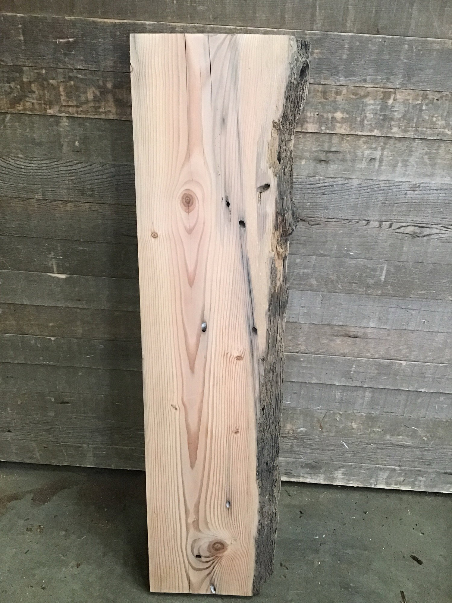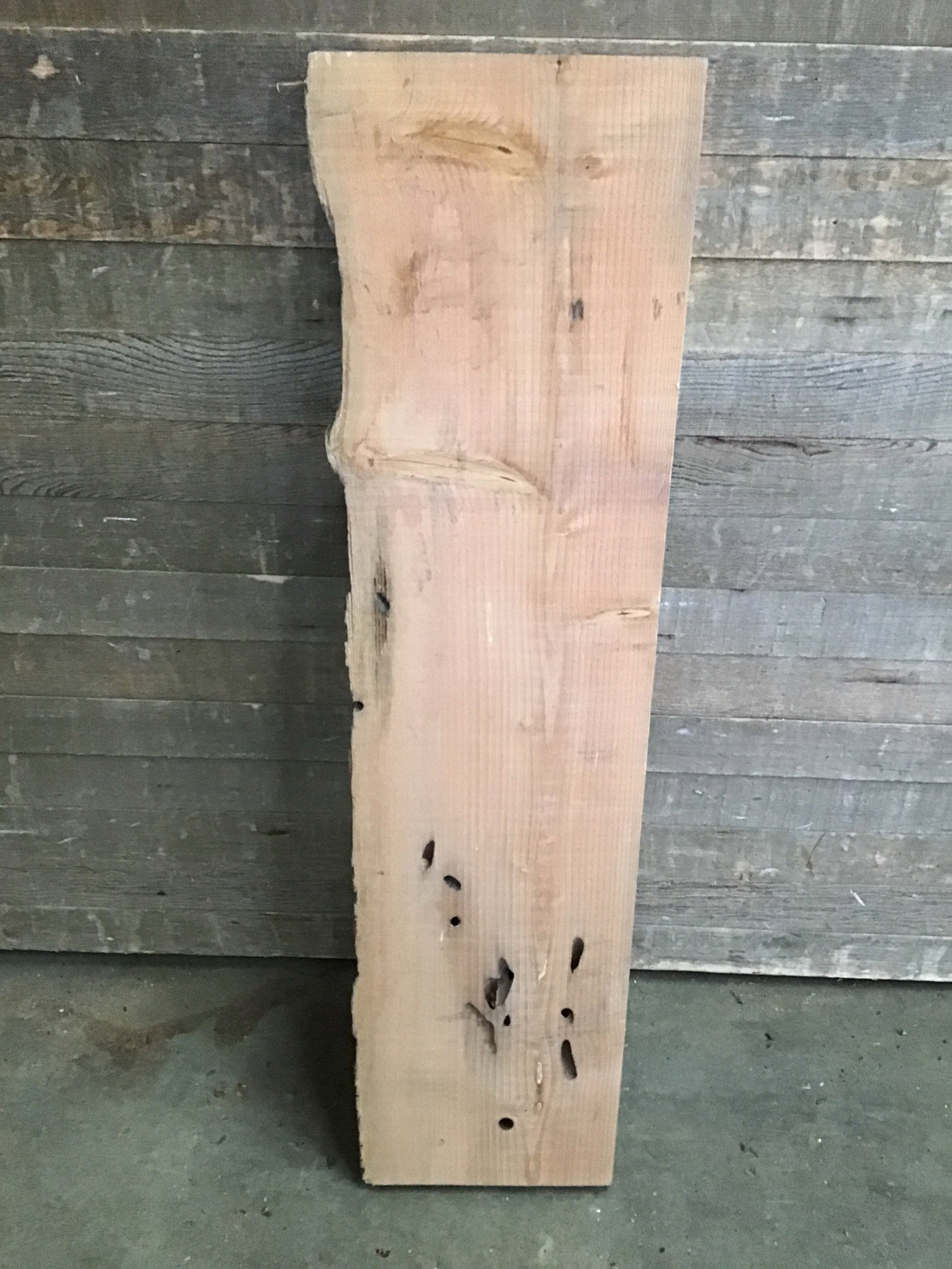 Locally milled and kiln dried live edge slab of hem/fir with a sanded broad side, live edge and some teredo clam burrows that allude to this lumber's former sea life.