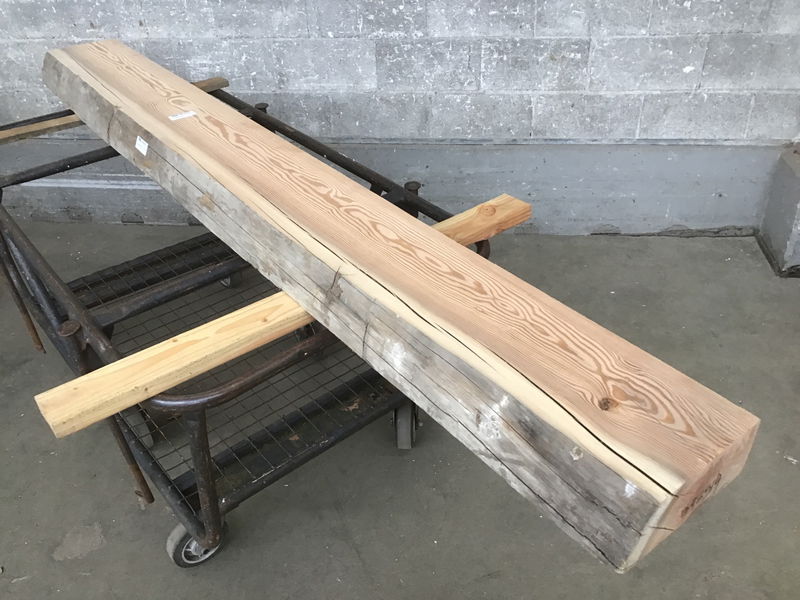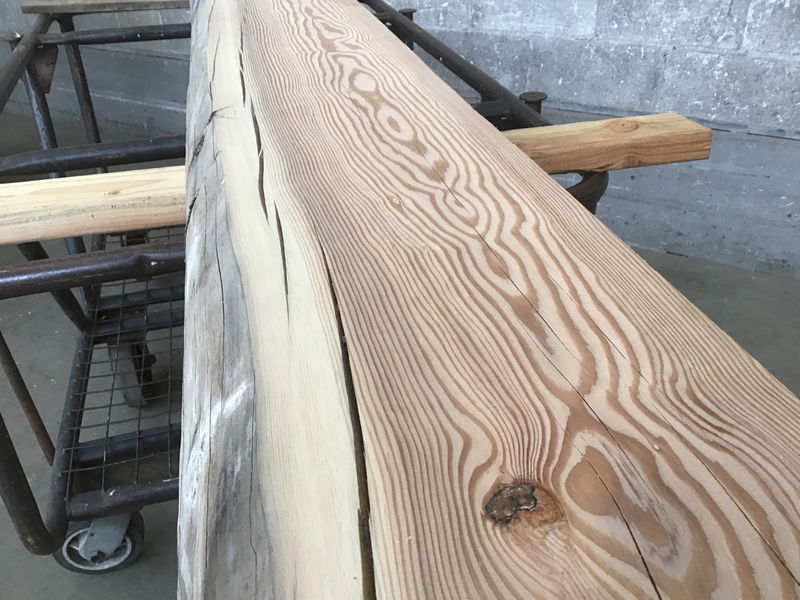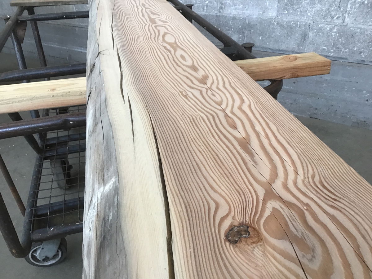 Locally milled & kiln dried. Sanded to 220 grit on one face. Has a great weathered live edge. Milled from salvaged Snohomish River dock pilings that were put in place in the 1960's. Blue/black stain from the iron oxide in the dock hardware and the minerals in the river.