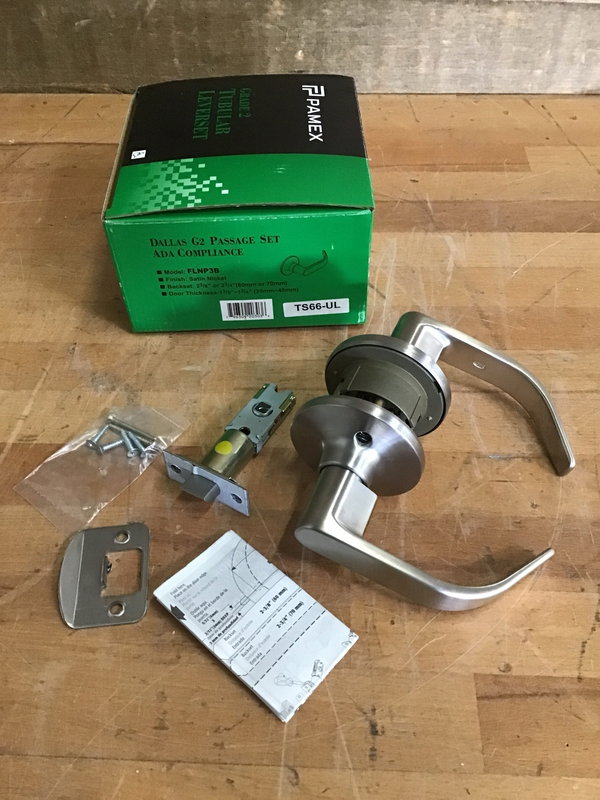 New box of Pamex "Dallas" G2 passage lever sets with a satin nickel finish. ADA compliant. Photo may be representative.