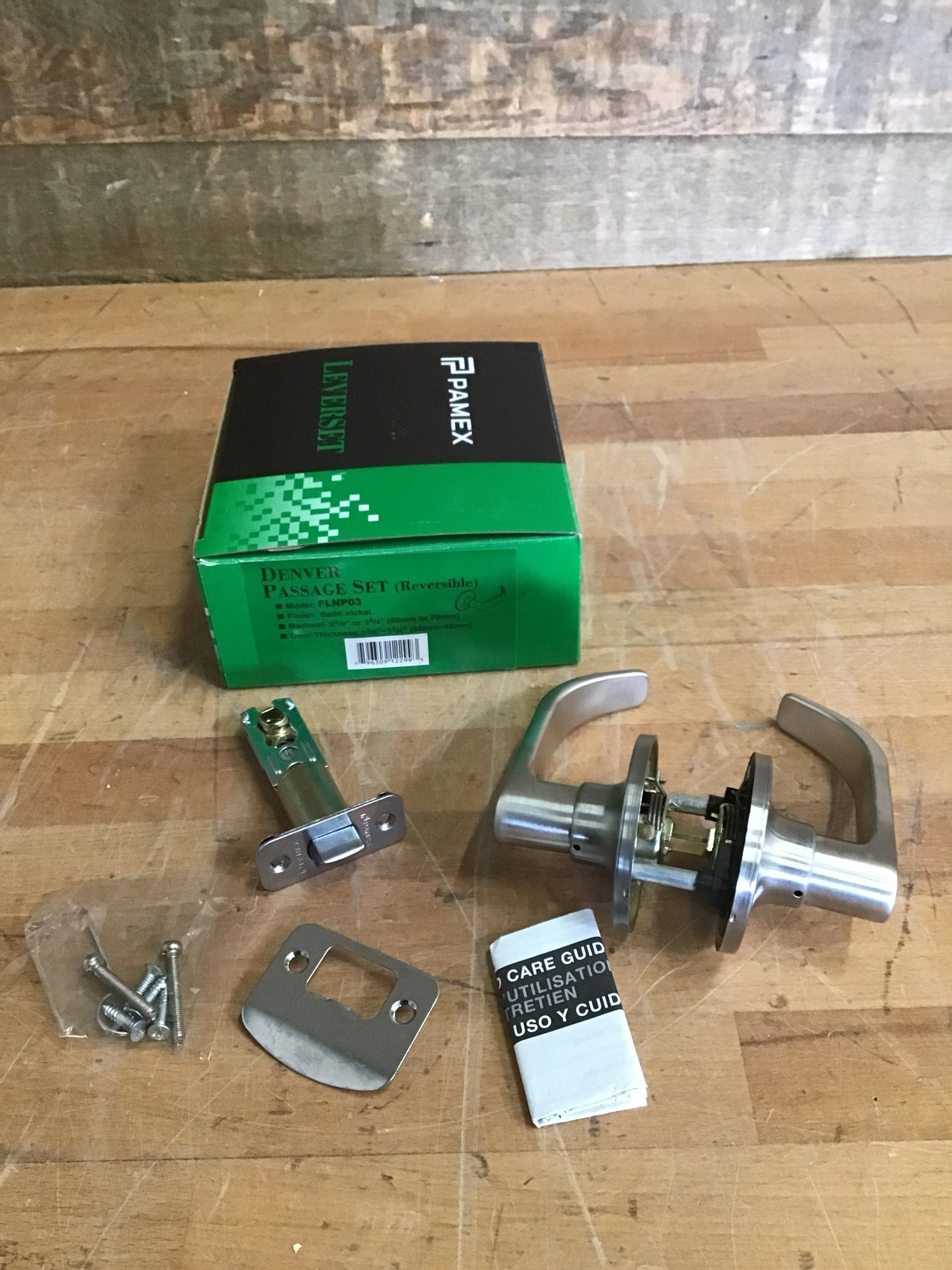 Brand new box of 24 reversible Denver passage levers with a satin nickel finish. This is a great deal for any contractors that use large quantities for their projects. Not interested in a box of 24? Come check out the same product hand priced individually at $8 each! Photo may be representative.