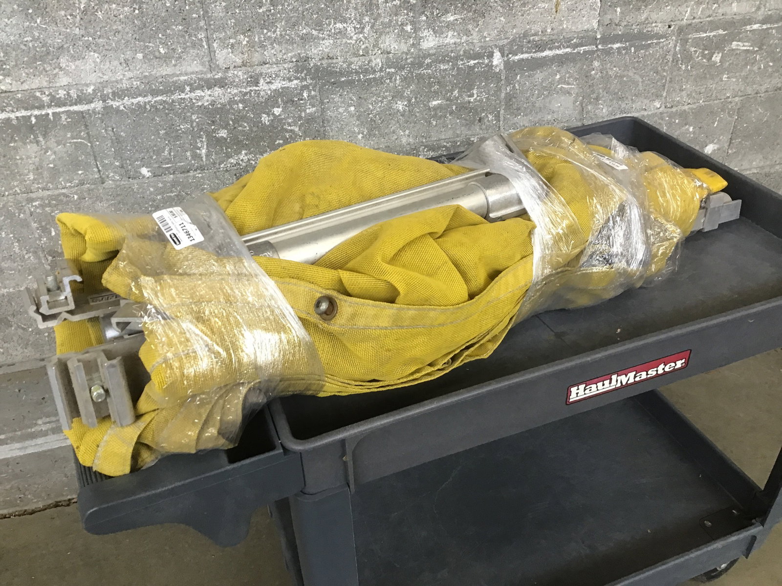 This is a yellow canvas safety barrier that has an aluminum frame. There is one short section and one large section.