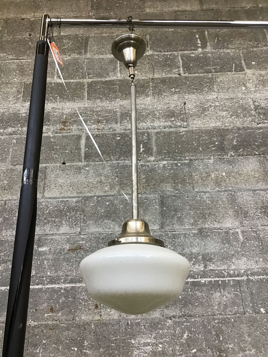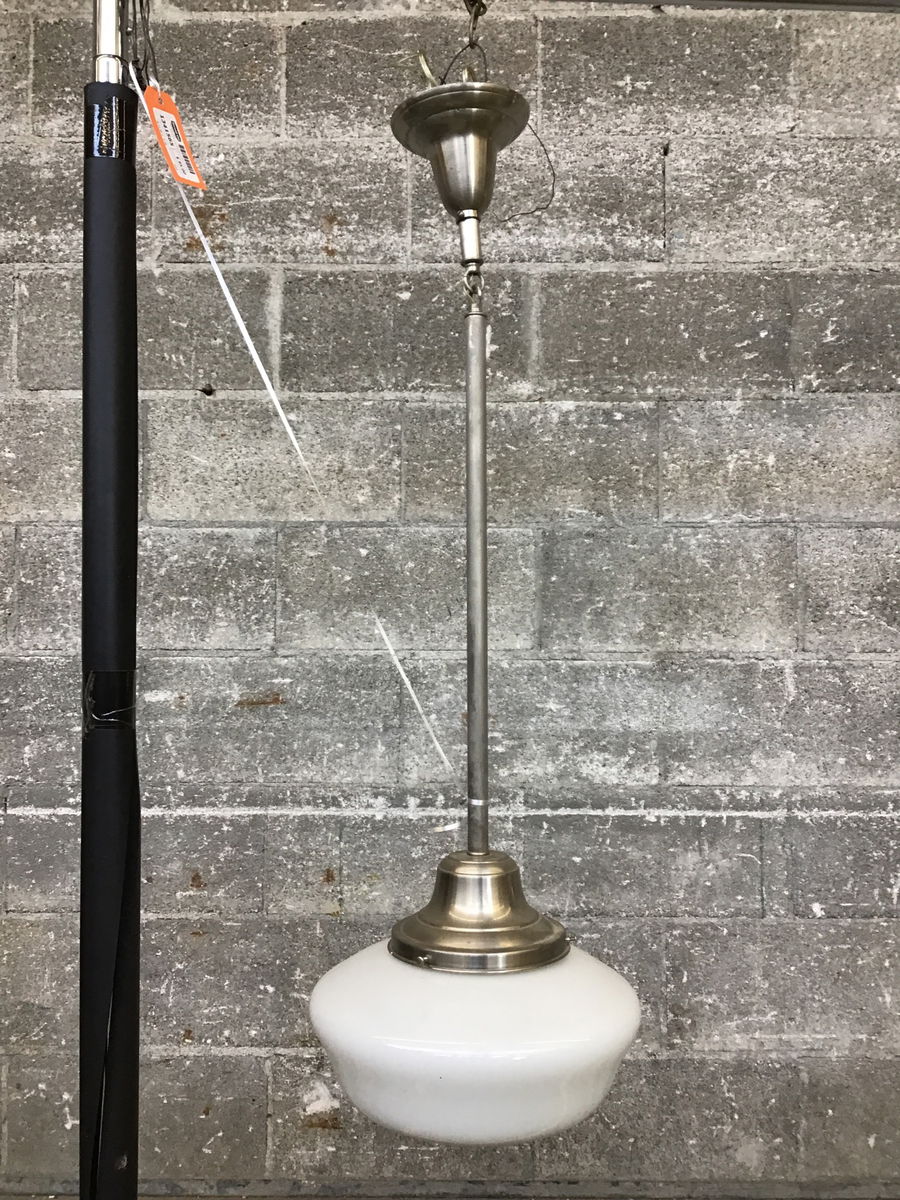 Classic schoolhouse pendant light with a nickel fitter and stem by Rejuvenation. Suitable for dry locations only.