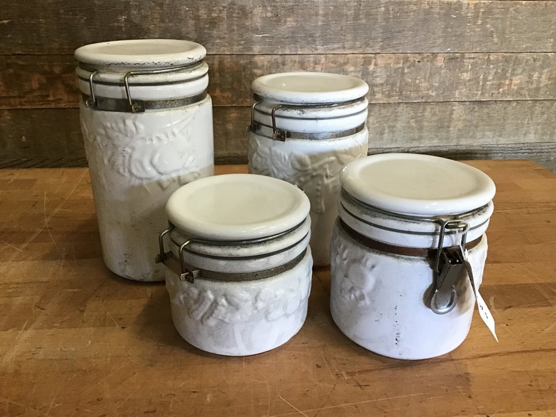 Set of 4 different sized vintage milk glass jars embossed with adorable fruit patterns. Metal locking bail closure works on all. Some cosseting imperfections but overall in good condition.