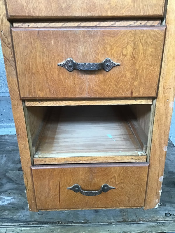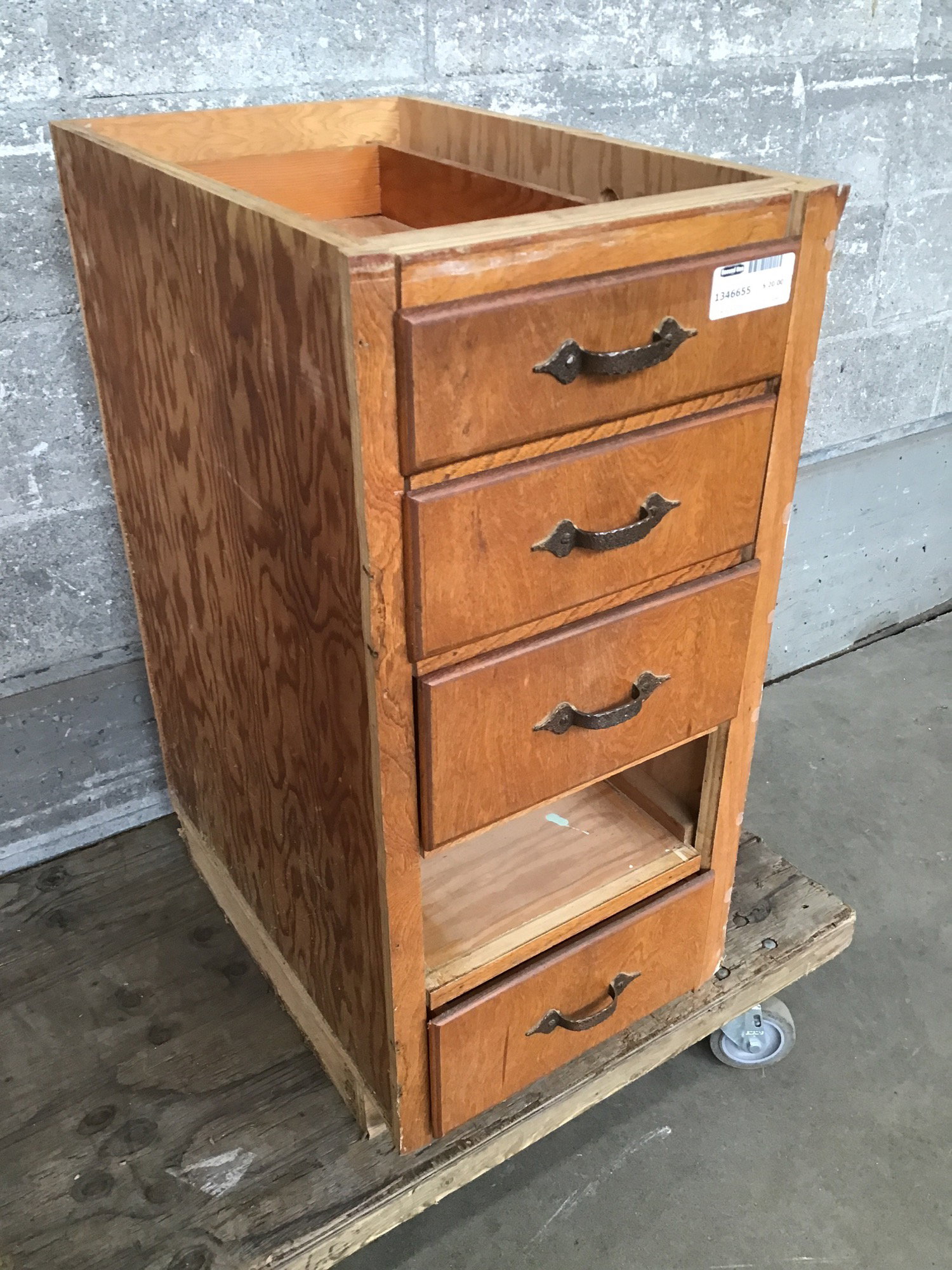 Fir faced plywood base cabinet with drawers. Probably best served as a shop cabinet. Price reflects that one drawer is missing.