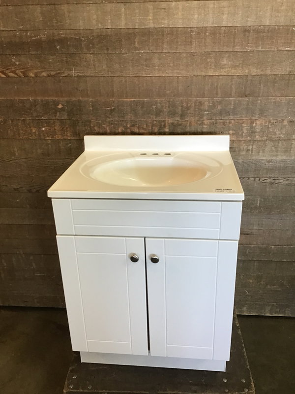 Simple yet nice bathroom vanity in good, used condition. Has two doors with brushed nickel pulls. Integrated sink/countertop with a small backsplash and a 4" center faucet width. There's some minor cosmetic damage, but overall ready to go, just in need of a faucet. Measurements are for overall footprint and includes the countertop.