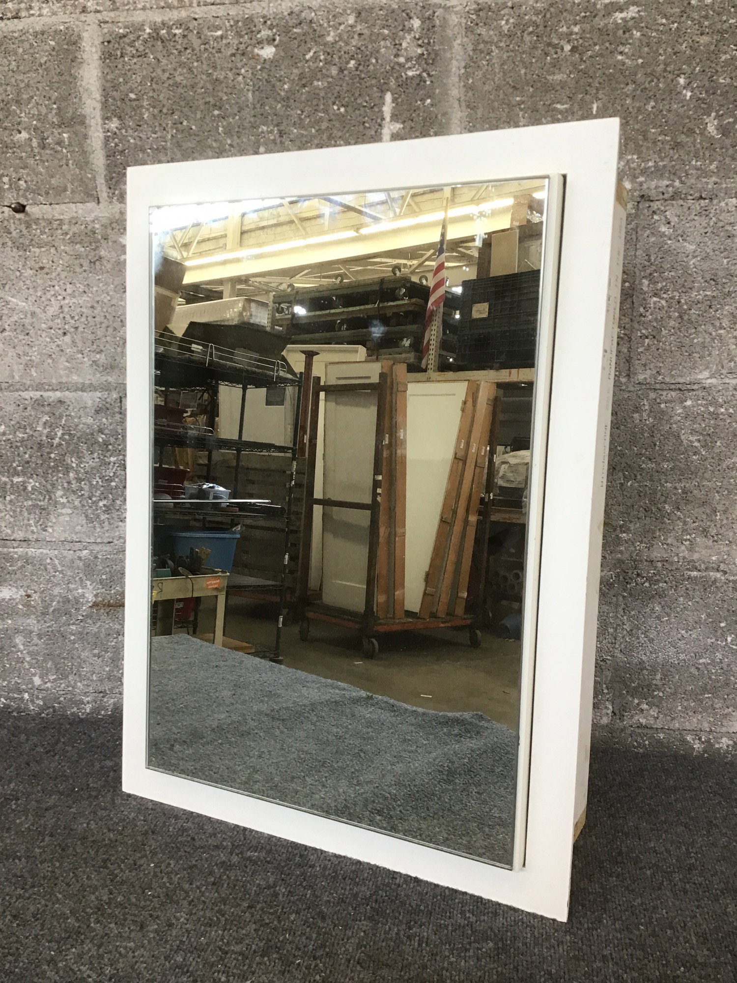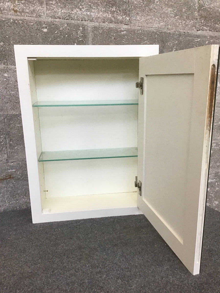 This is a simple built-in medicine cabinet that is primed white and has one door with a mirror. Comes with two glass shelves.