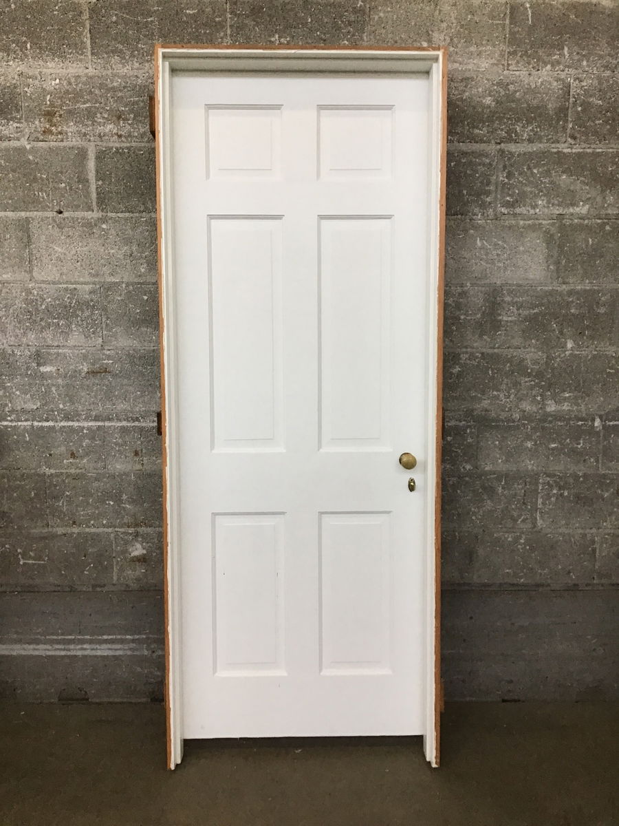 Vintage six panel door with jamb and hardware, in good condition.