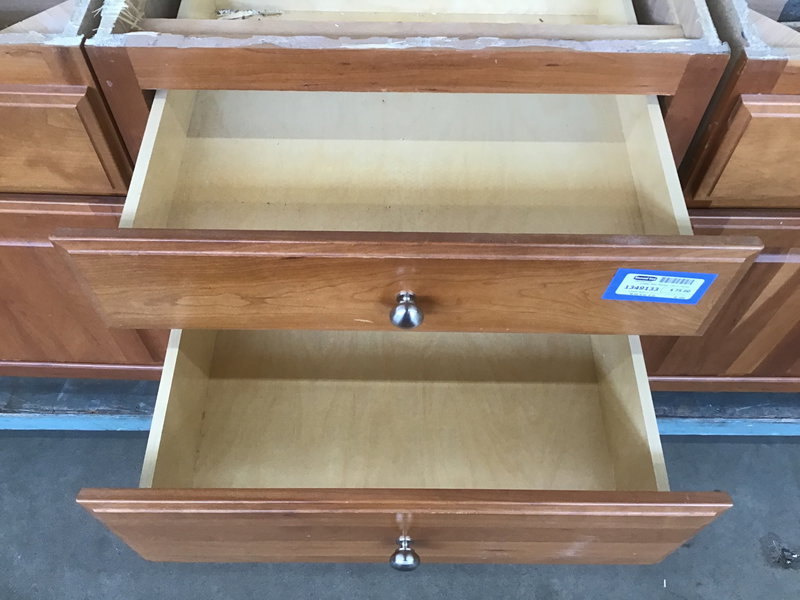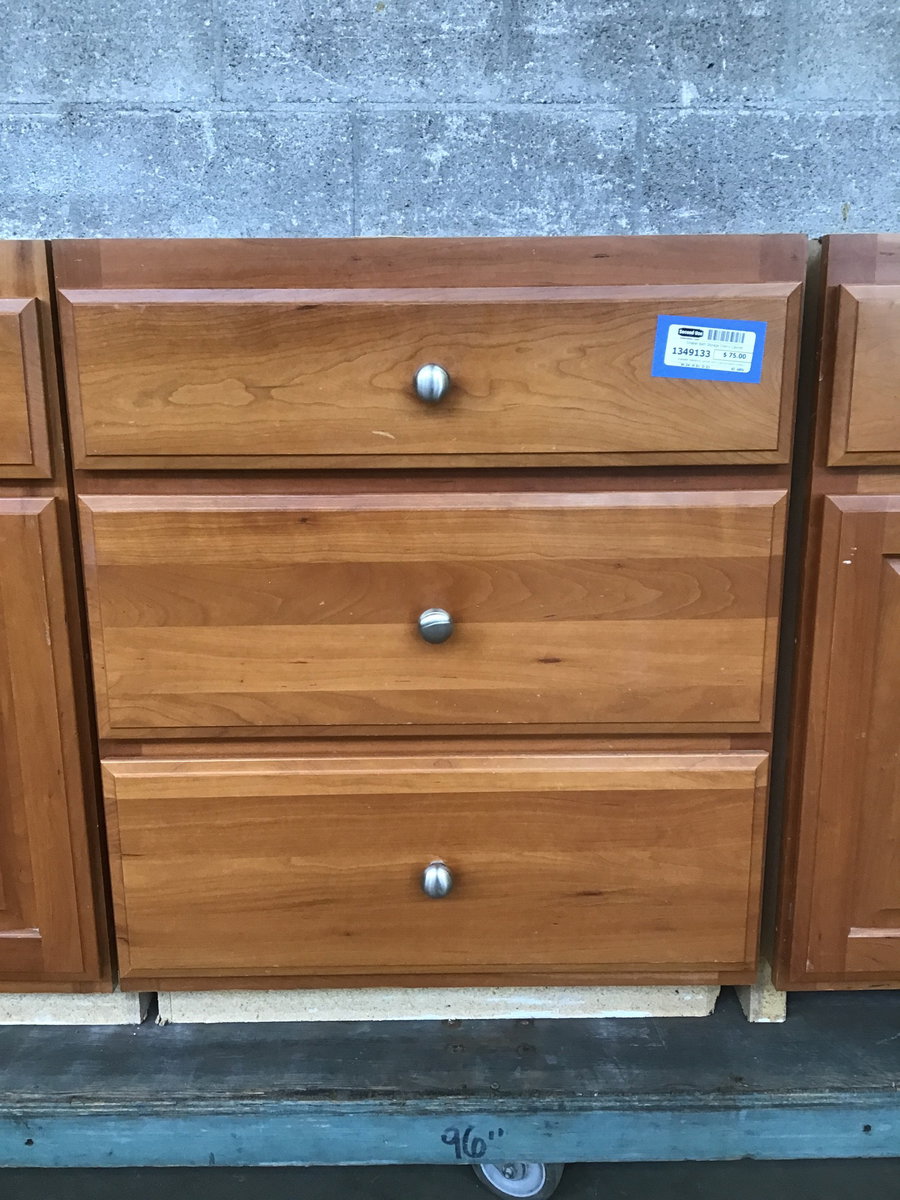 A smaller residential cabinet with a particle board construction, cherry wood face, raised panel detailing an brushed nickel hardware. This would make for great extra storage space in a bathroom or in any other residential space.