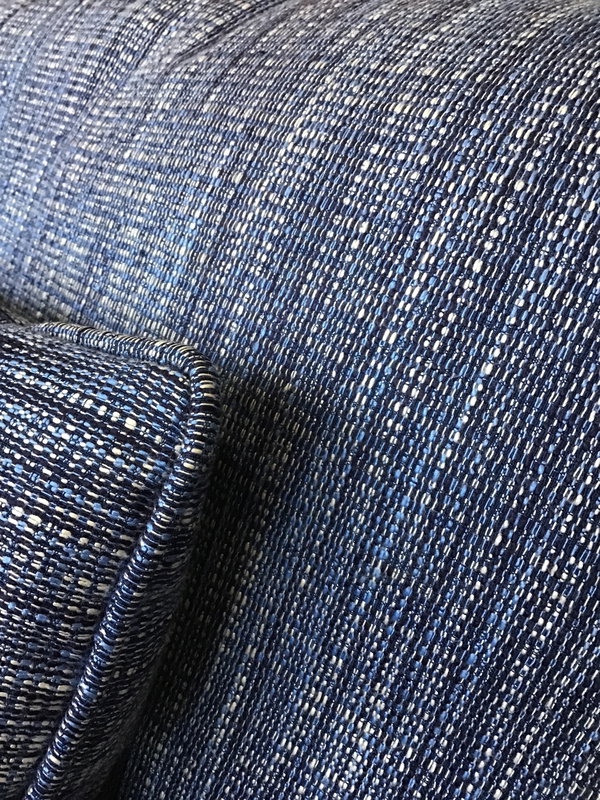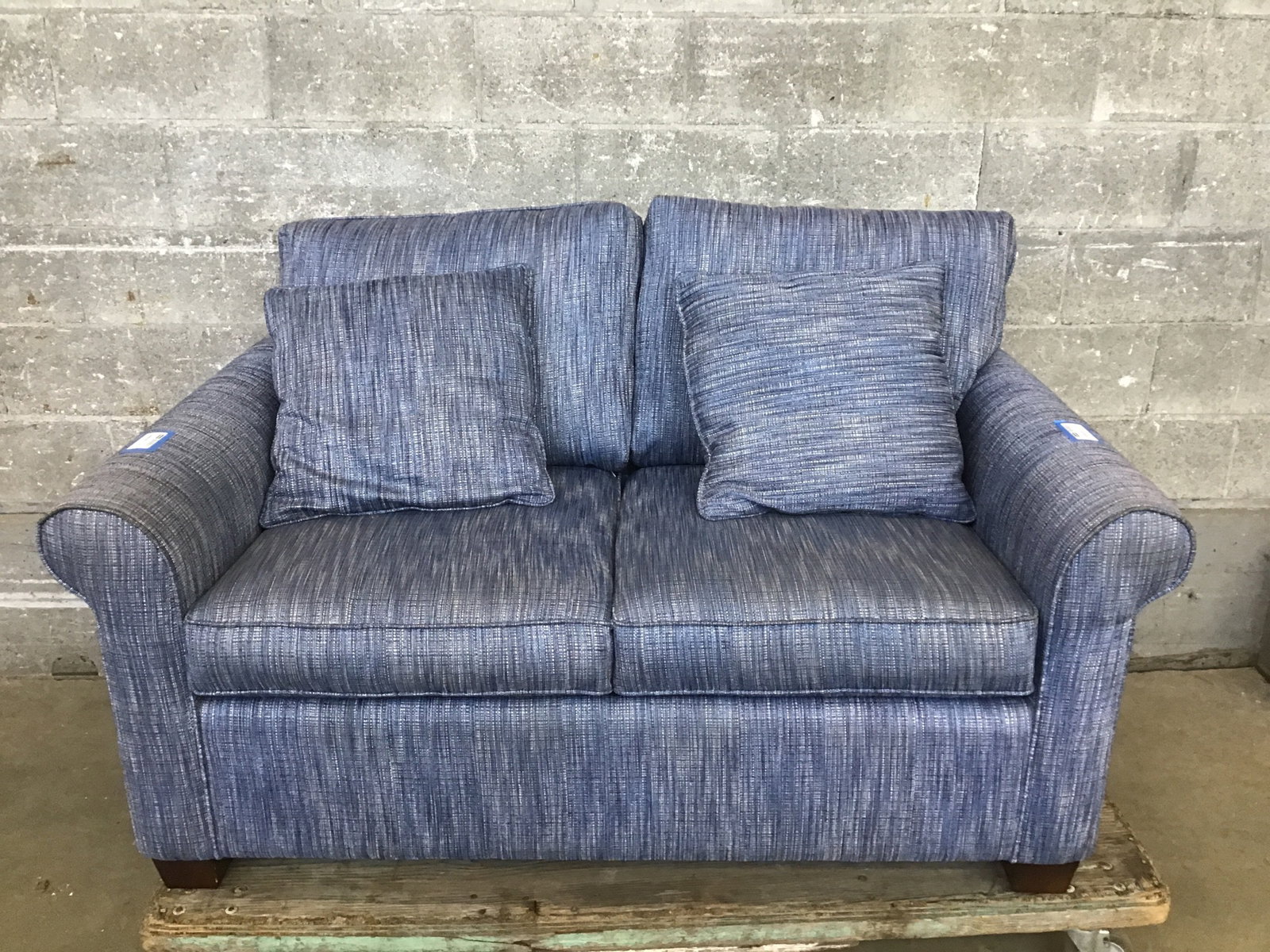 This loveseat from Braxton Culler is upholstered in a blue & white fabric that almost reminds me of denim in a way. The fabric is insanely soft and pleasing to the touch. Comes with two matching throw pillows.