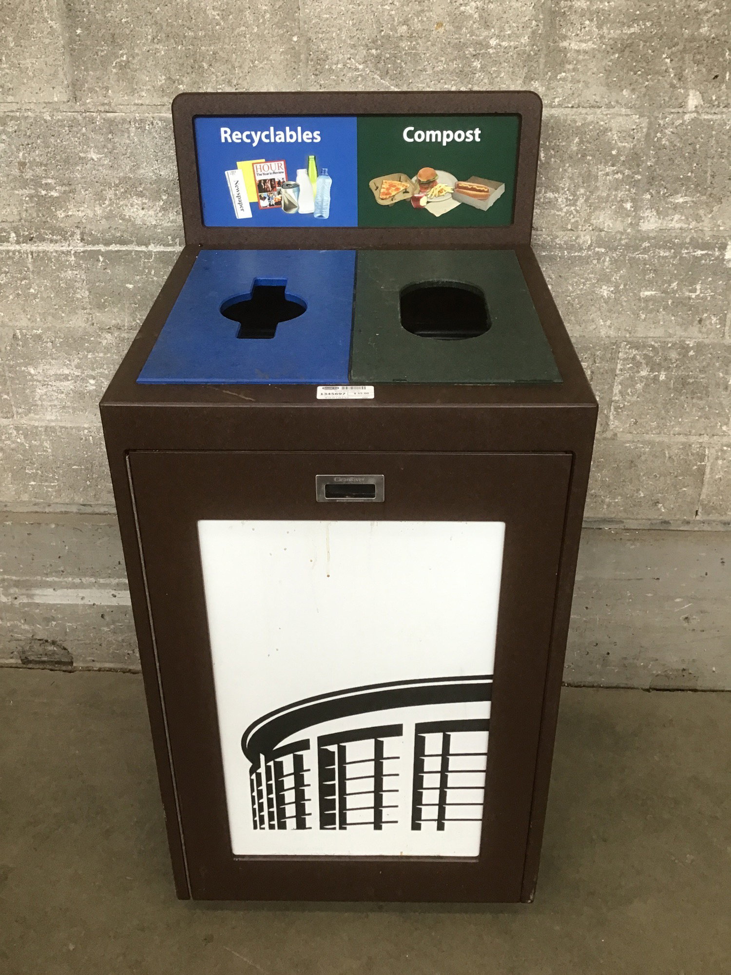 A big ol' trash can for some trash-making events. Currently has the blue/green recycling and compost configuration installed.