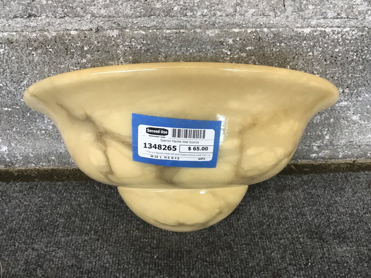 This is a Spanish-made half shell shaped sconce made from marble and takes one bulb. The color is very earthy tone.