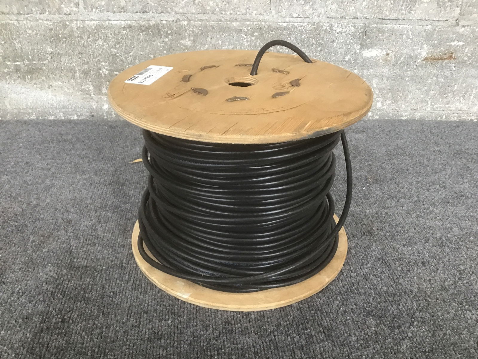 A decent amount of black coax cable rolled into a wood spool. Unsure of total length, but there appears to be a good amount.