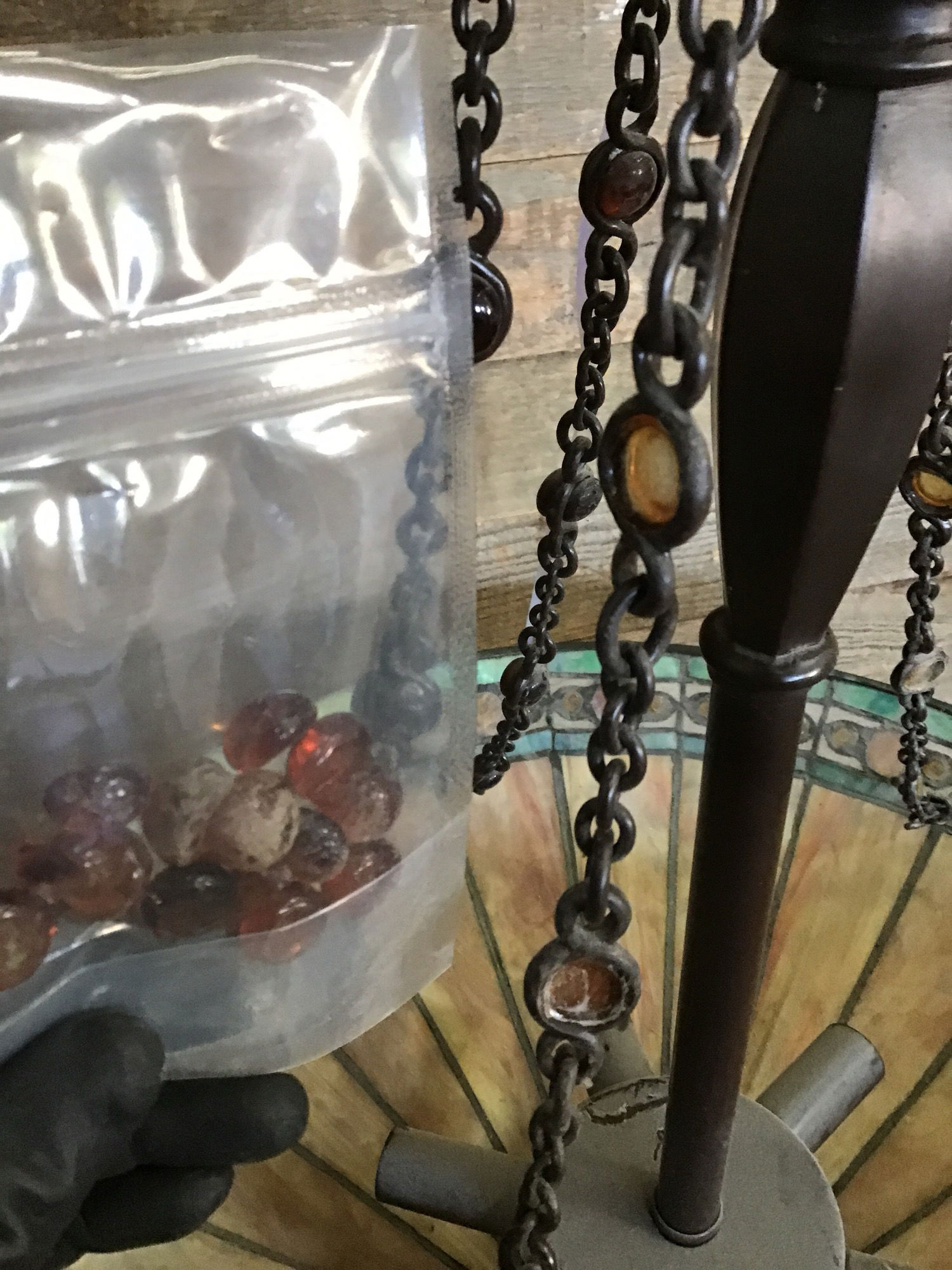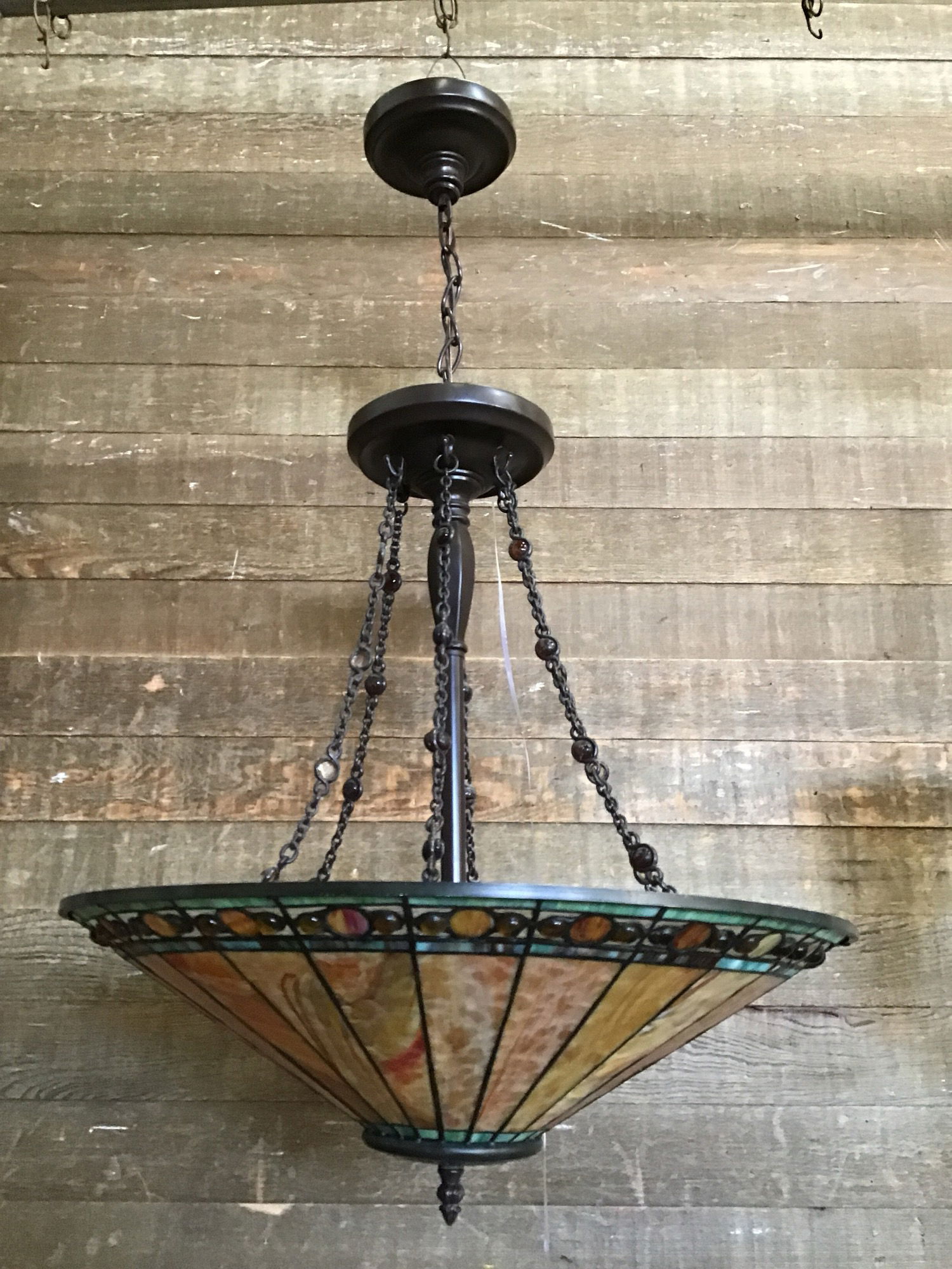 Beautiful stained glass bulb that fits six small bulbs. It has five beaded chains connecting to the base. The stained glass is in great shape and would look great in a dining area. Some of the beads from the chain need to be glued back into place. Wiring looks great, though we always recommend a full test prior to installation.