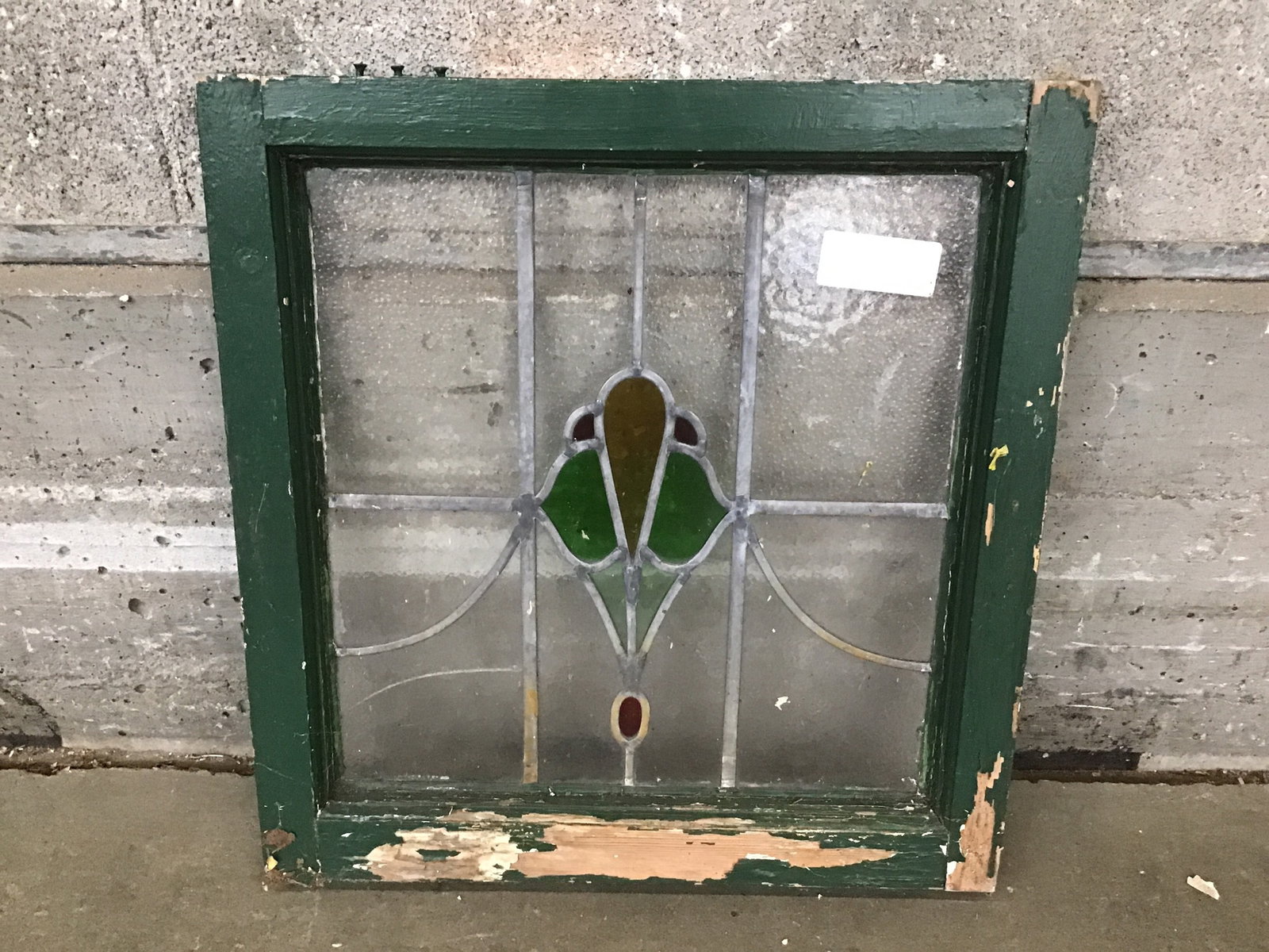 Stained, obscured, and leaded glass sash with one cracked pane. Price reflects condition.
