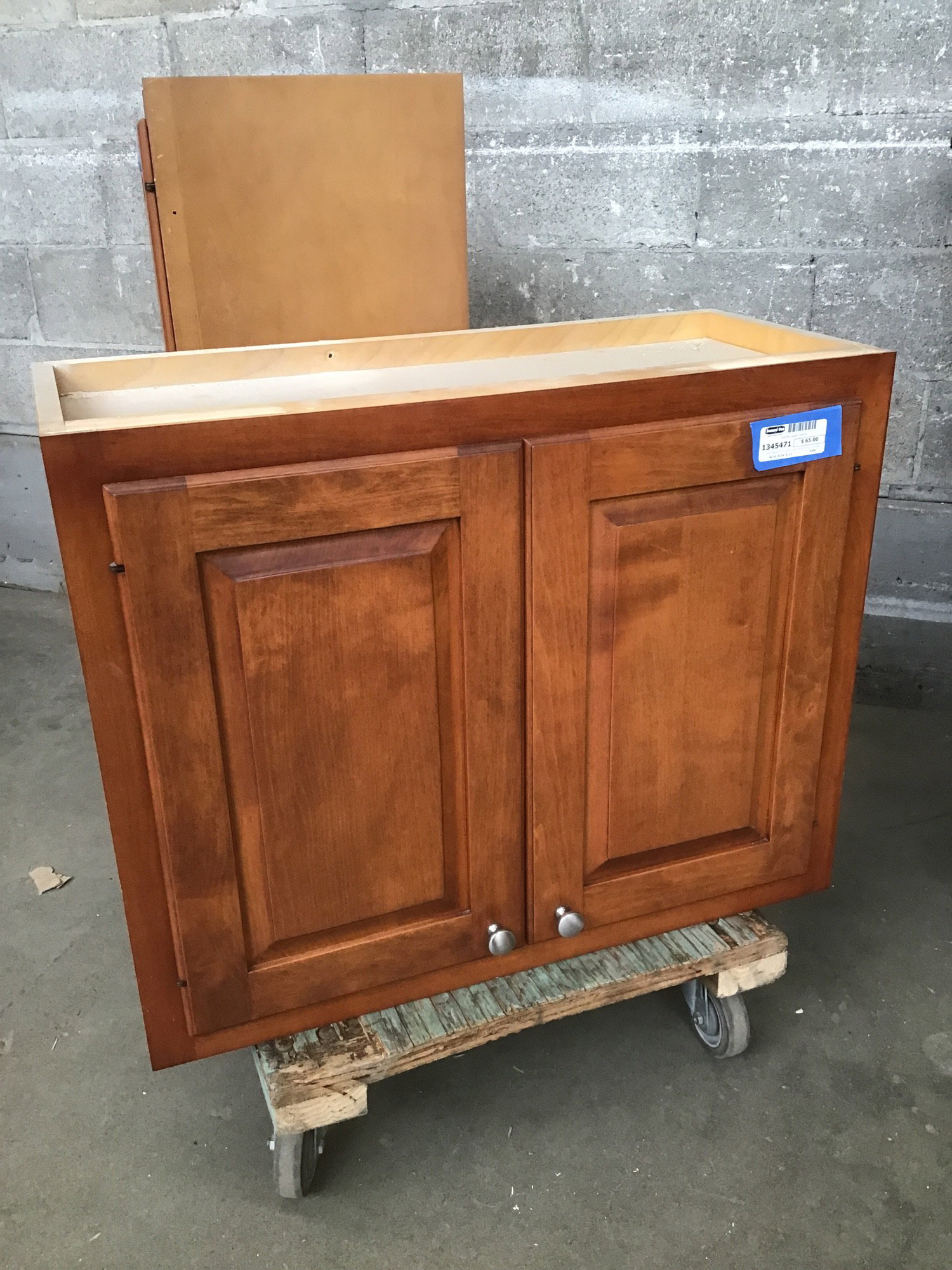 Warm stained birch? maple? upper cabinet that is in incredible condition for its age. Looks modern right? Raised panel, standard construction, modern knob..... This baddie is from 1963! WOW. Clean, free of damage, and made out of lumber core.
