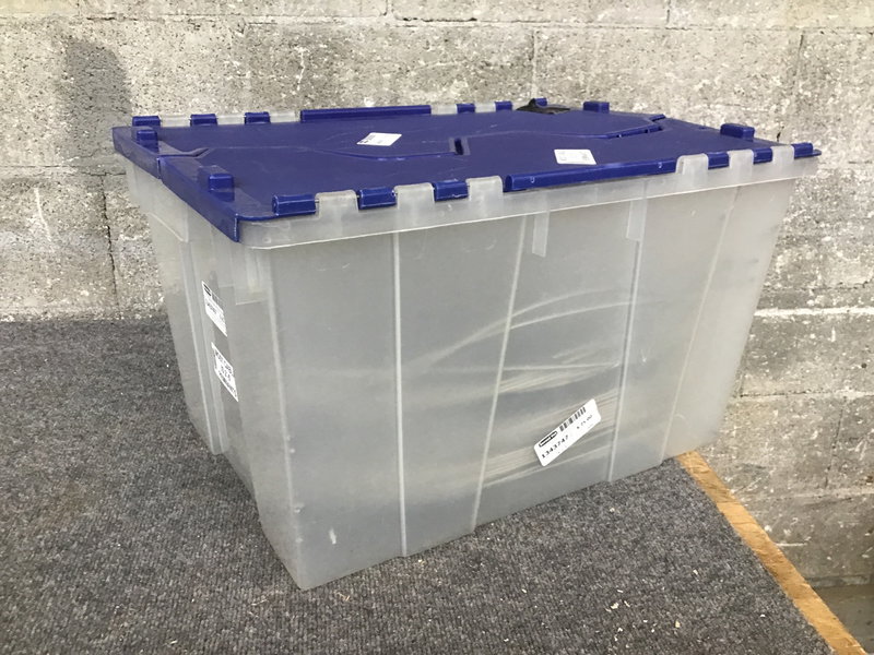 Tote of stainless steel cable railing cut offs that look to mostly range for 2' to 5'. There might be a few lengths of 8-10', but most are what's listed. There are a few accessory pieces/hardware, as well.