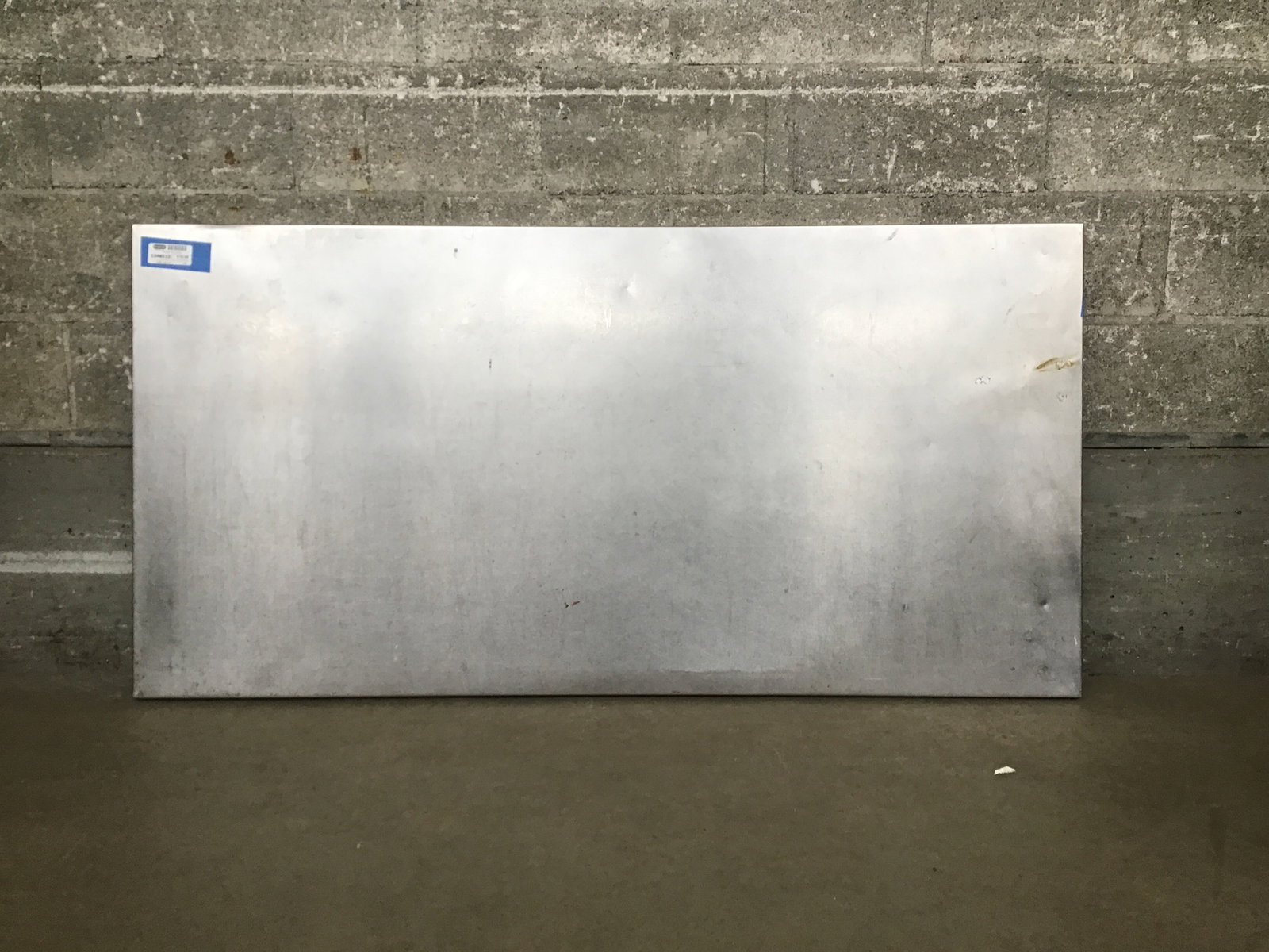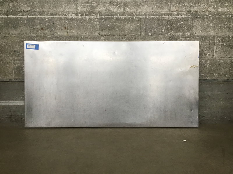 A stainless steel tabletop who seems to have lost its legs some time ago, despite still having the brackets to attach them.