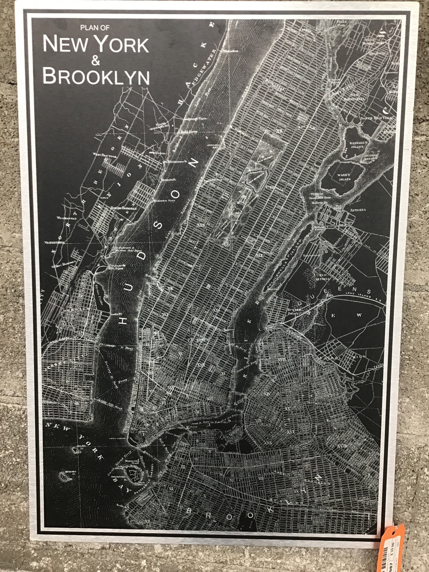 A map of New York and Brooklyn printed on stainless steel. Manufactured by Ikea for their Kopparfall collection. Discontinued in the States, but retails for about $60 after converting from the Euro.