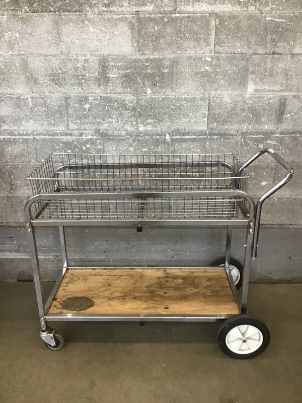 A steel push cart with wire basket on top and plywood shelf on the bottom. Has 4 wheels and a push handle. There's some light rust happening, but it's in good shape otherwise.