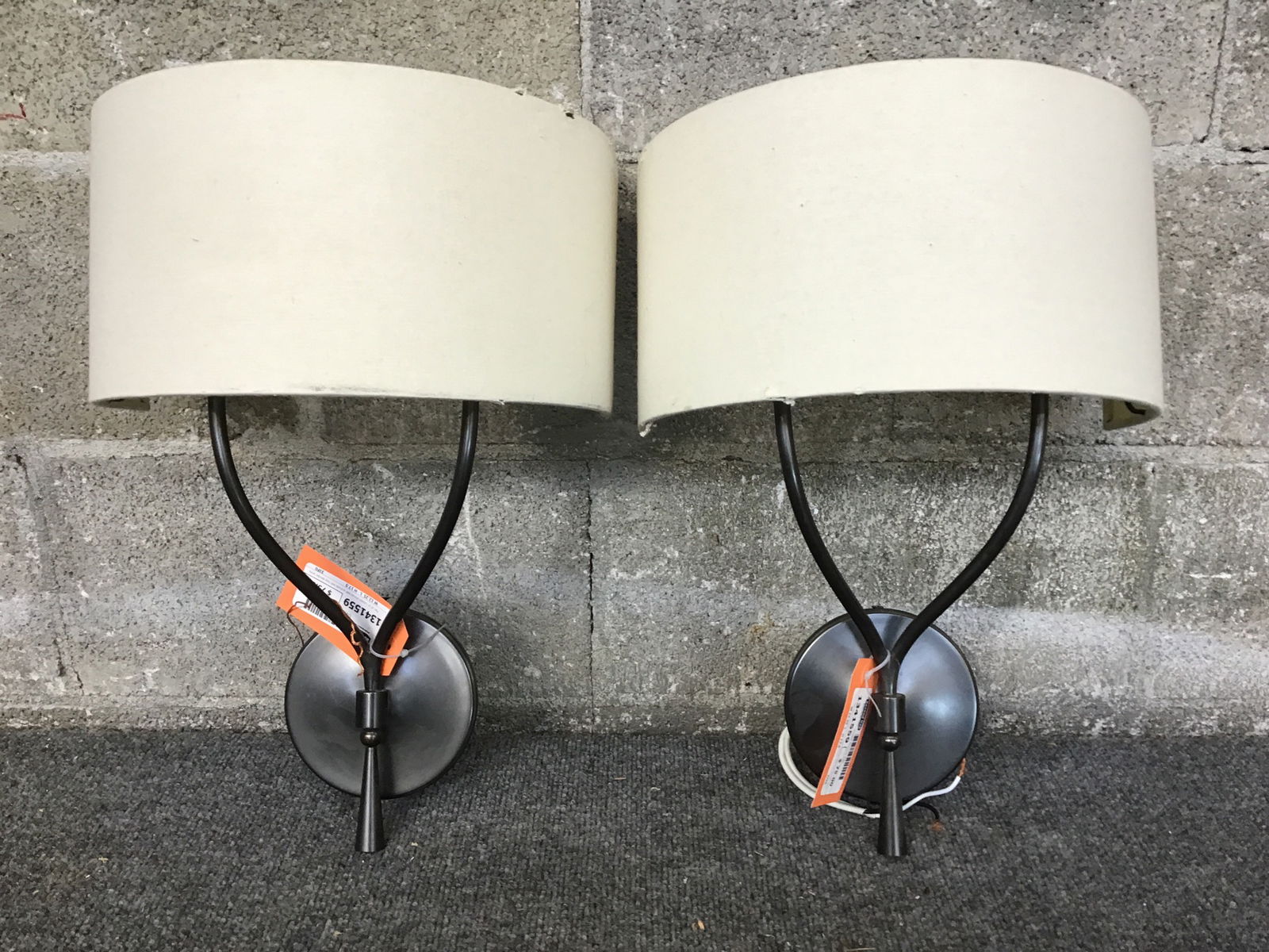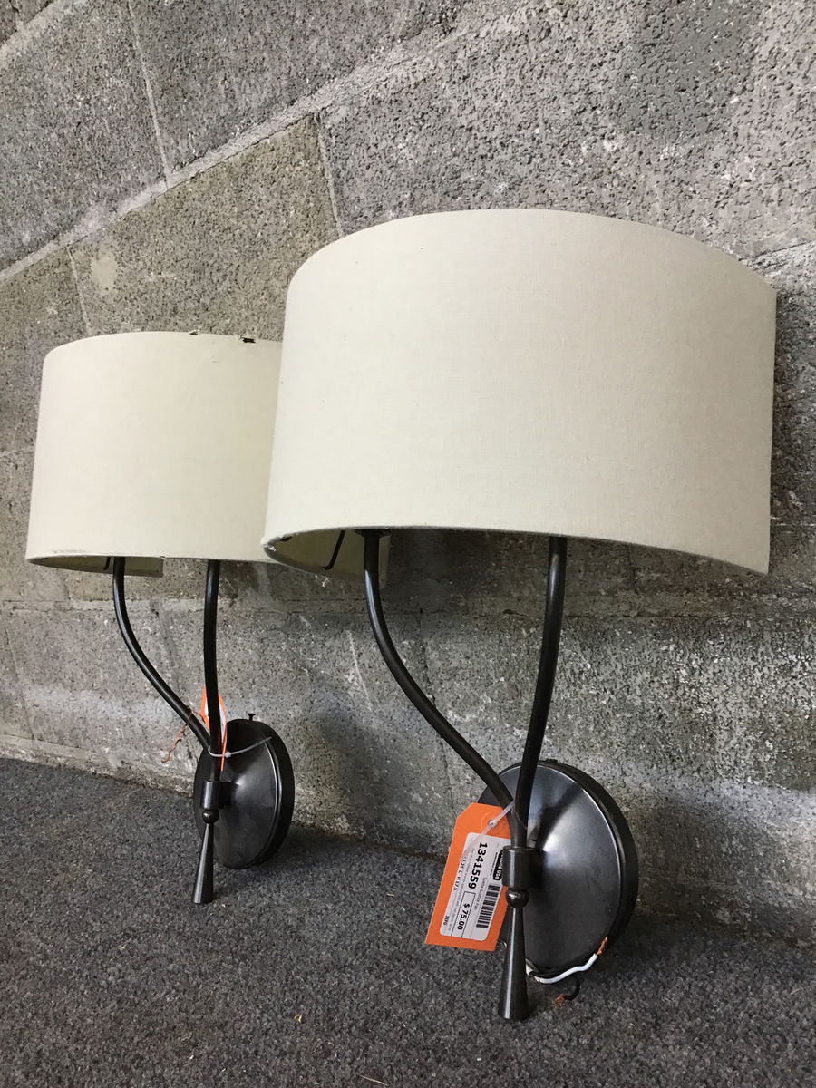 Pair of oil rubbed bronze wall sconces with two slender arms and a semicircular linen shade. There's some wear to the shade but the fixture appears to be in great shape otherwise. Suitable for dry locations only.