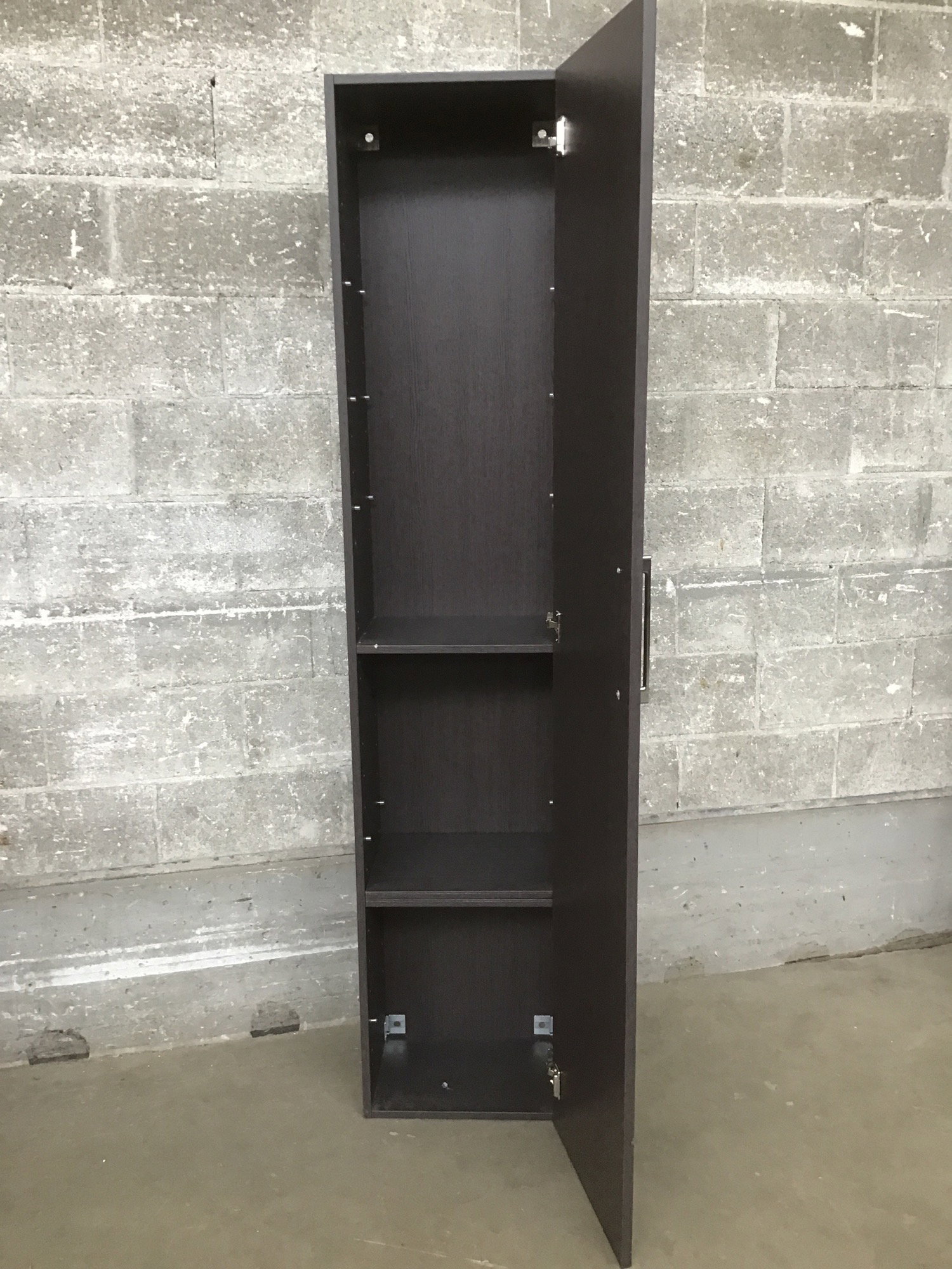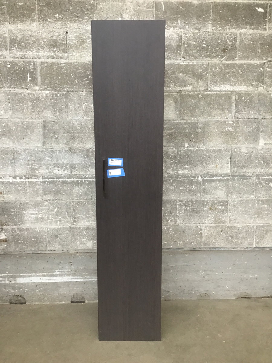 A tall and narrow storage cabinet with a particle board construction, dark brown faux wood grain, one large door, two particle board repositionable shelves and three repositionable glass shelves. These would make great office/work room storage space or even in the kitchen for some extra storage.