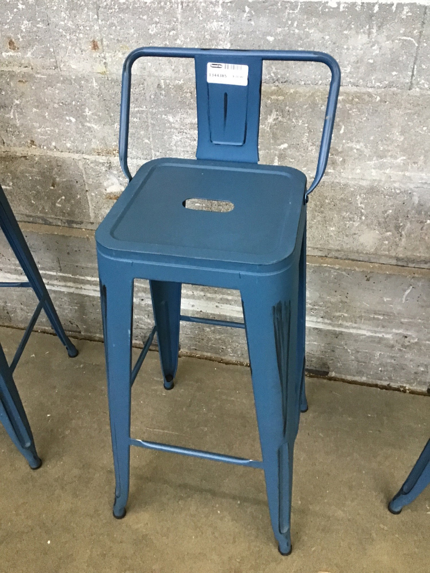 This is a lightweight and tall metal bar or cafe chair that you have definitely seen if you like to eat outdoors at those places. Has some scuffing on the legs that could be wiped off or painted over.