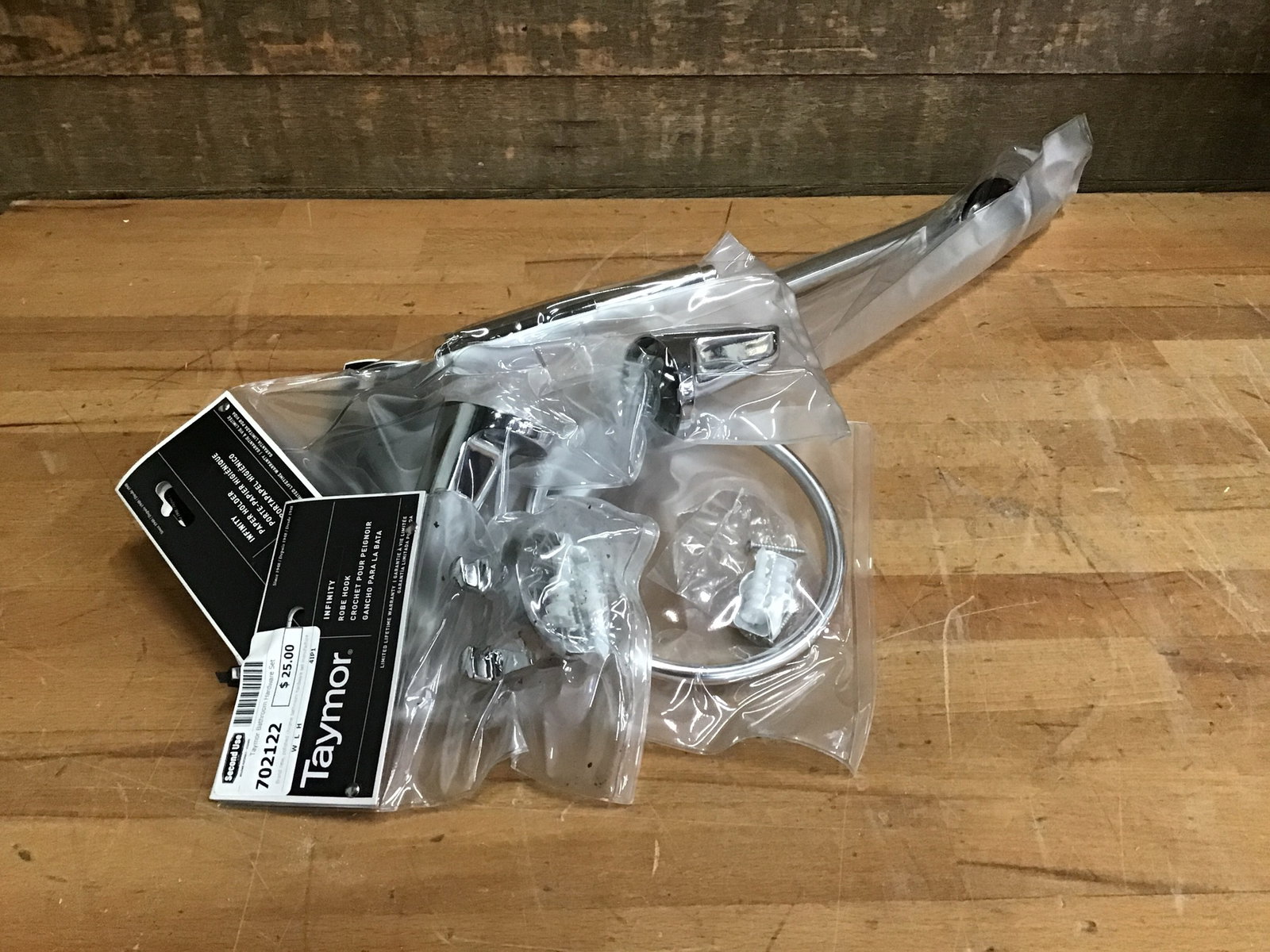 Brand new, polished chrome bathroom hardware set manufactured by Taymor. Made of zinc/aluminum! This set includes one 24" x 3/4" towel bar, paper holder, double robe hook and towel ring. Nice little deal for ya!