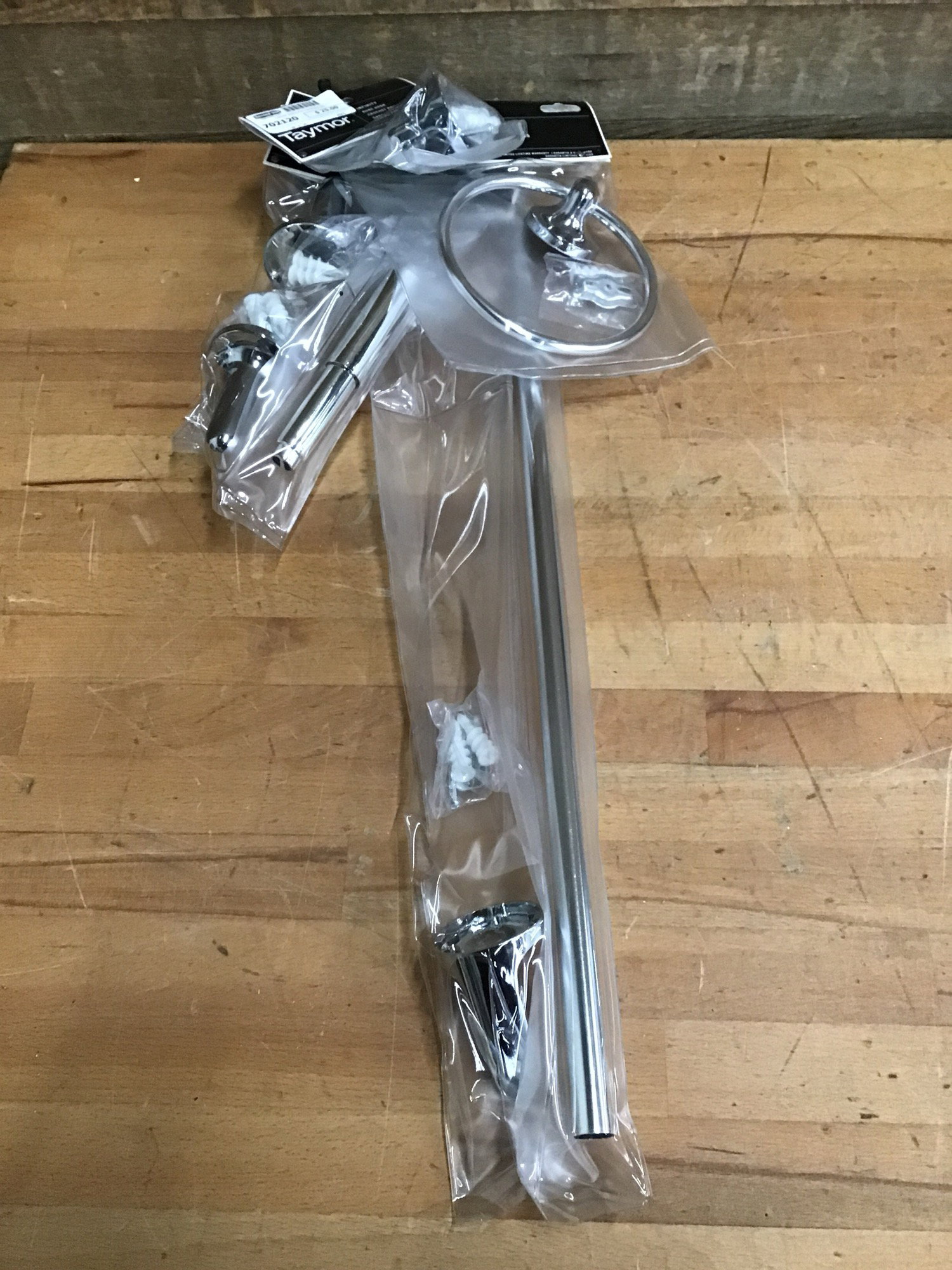 Brand new, polished chrome bathroom hardware set manufactured by Taymor. Made of zinc/aluminum! This set includes one 24" x 3/4" towel bar, paper holder, double robe hook and towel ring. Nice little deal for ya!