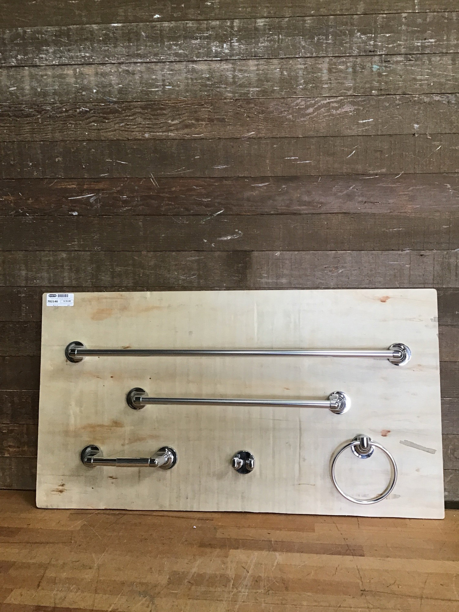 Brand new, polished chrome bathroom hardware set manufactured by Taymor. Made of zinc/aluminum. This set includes one 24" x 3/4" towel bar, 30" x 3/4" towel bar, paper holder, double robe hook and towel ring. Nice little deal for ya!