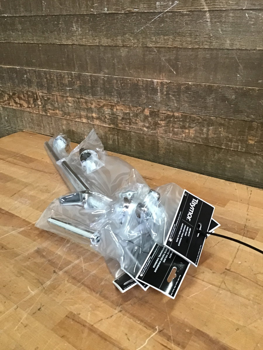 Brand new, polished chrome bathroom hardware set manufactured by Taymor. Made of zinc/aluminum. This set includes one 24" x 3/4" towel bar, 30" x 3/4" towel bar, paper holder, double robe hook and towel ring. Nice little deal for ya!
