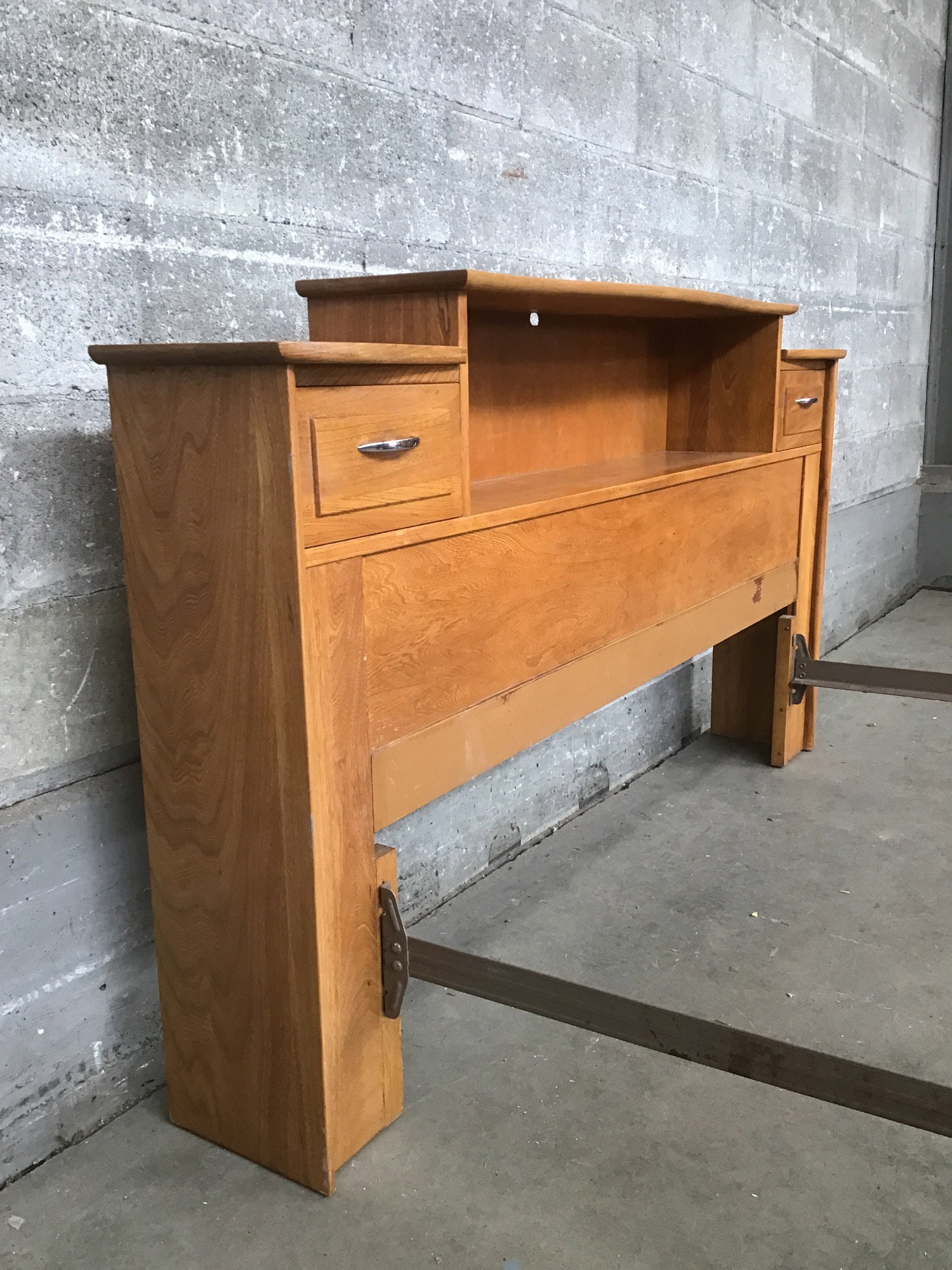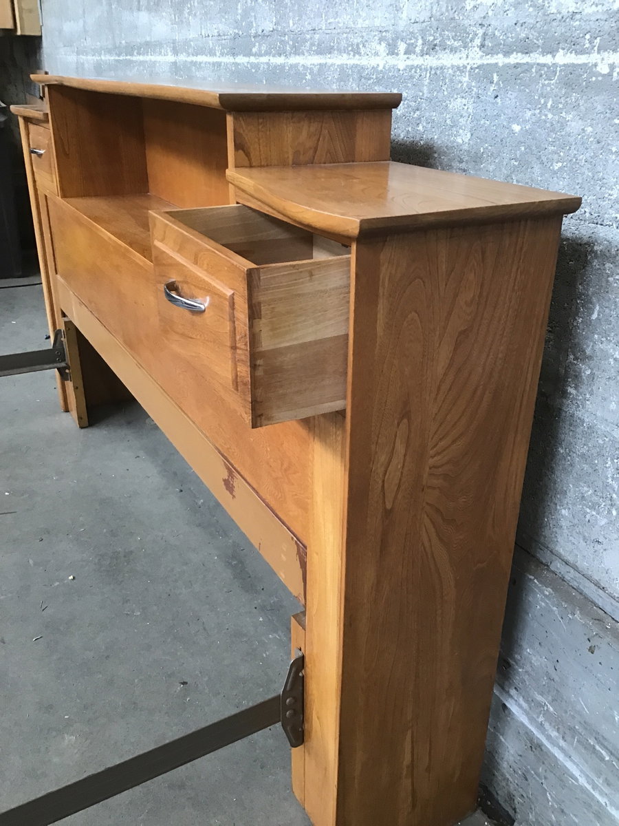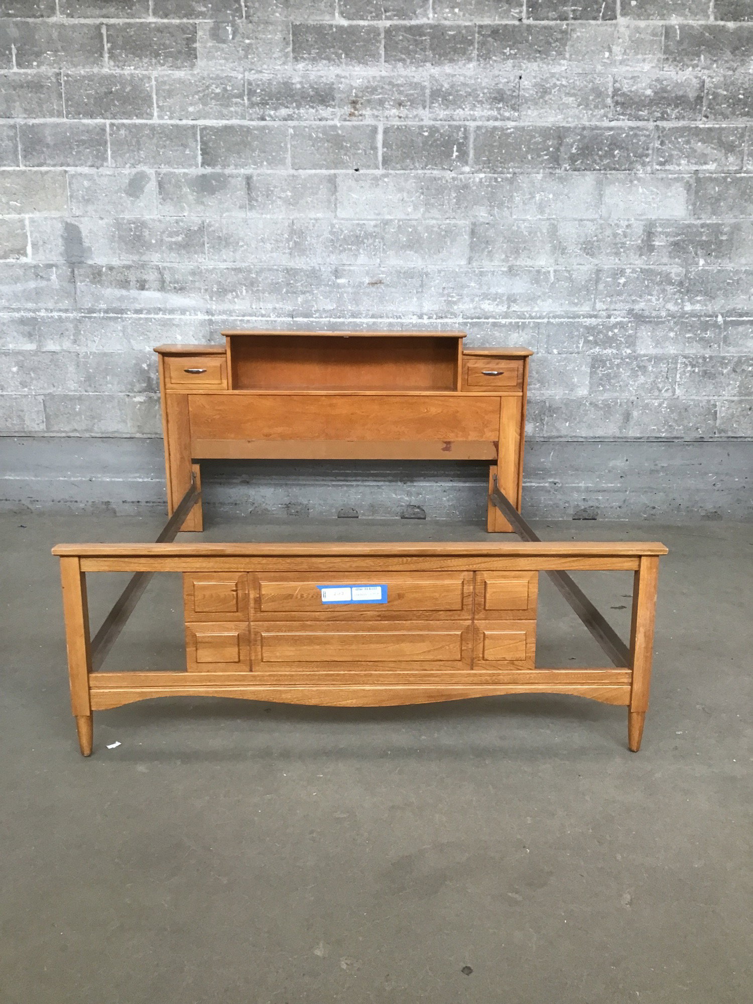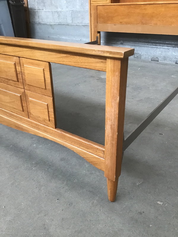 A full-size bed frame sporting rich Teak construction for the headboard and footboard with steel side rails. The headboard comes with some storage, with two drawers on either side and a wide cubby space for tchotchkes, knick-knacks, or some houseplants to give it a bit of your own personality!