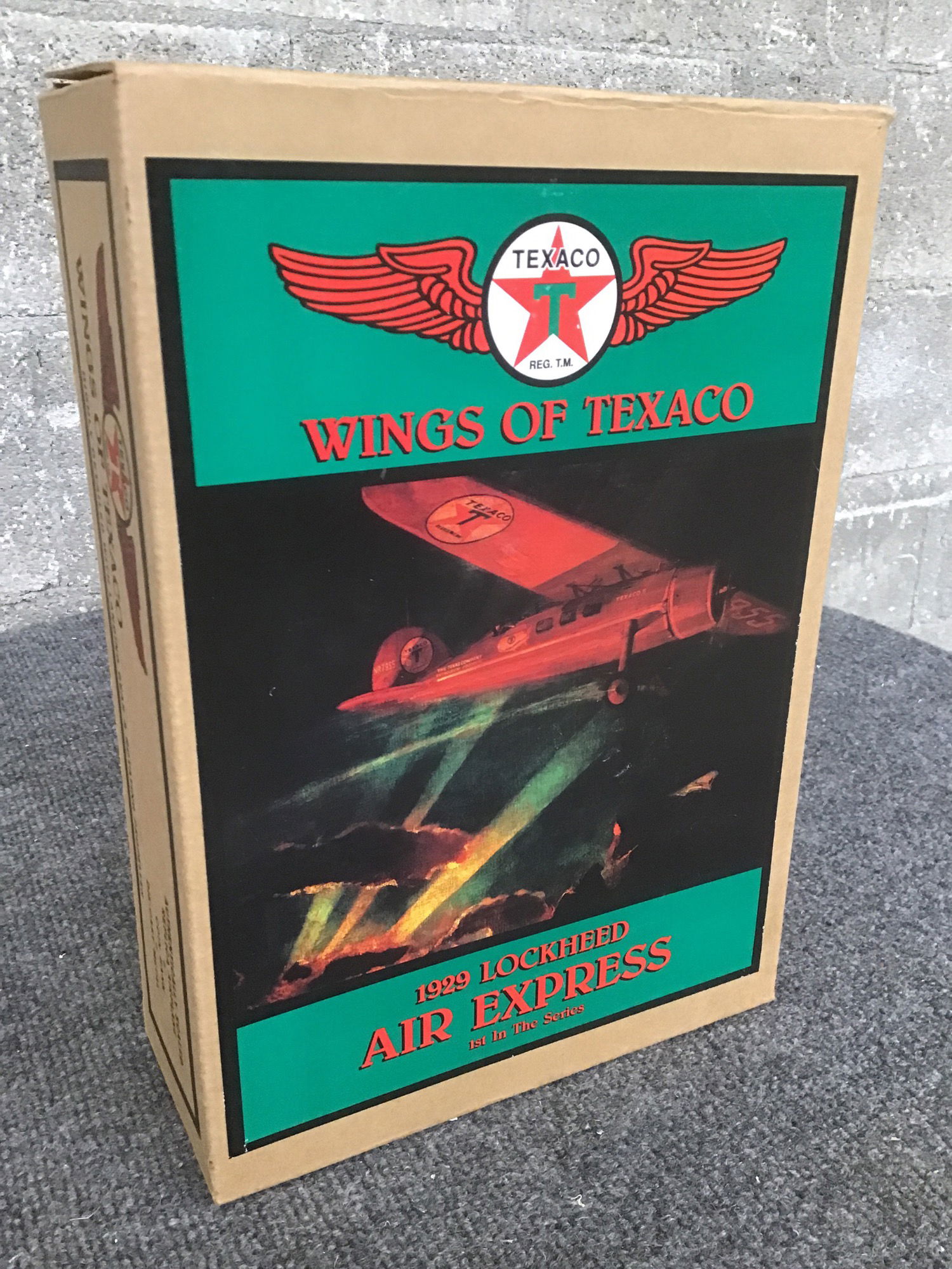 Texaco die cast model airplane with original box. Contains a 1st in series 1929 Lockheed Express. Listed dimensions are for the box.