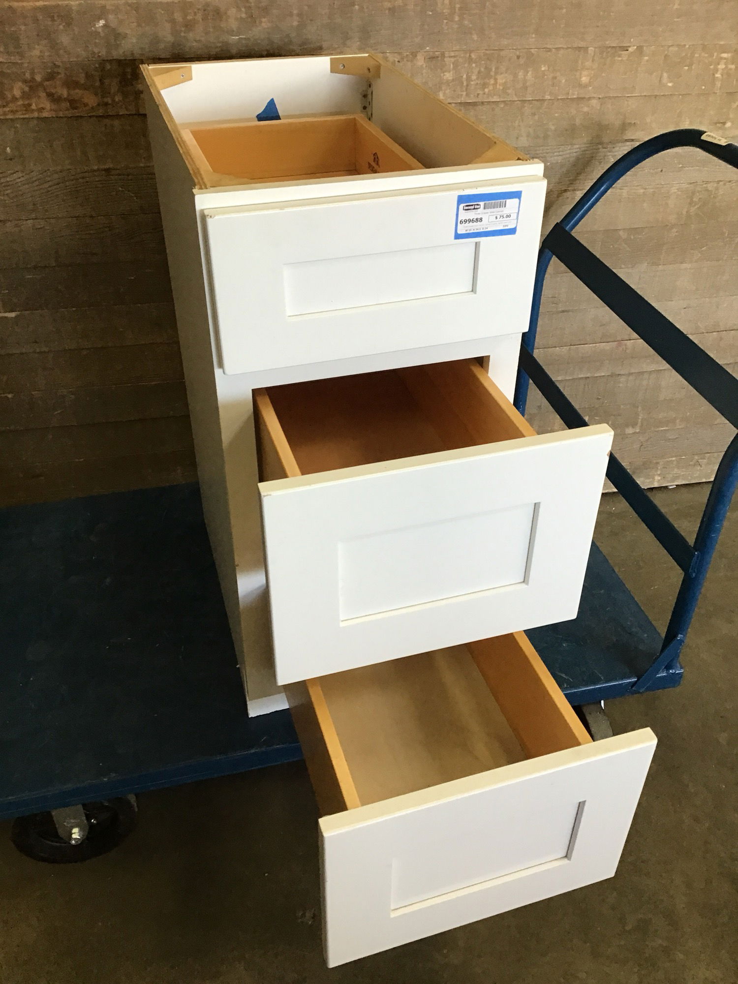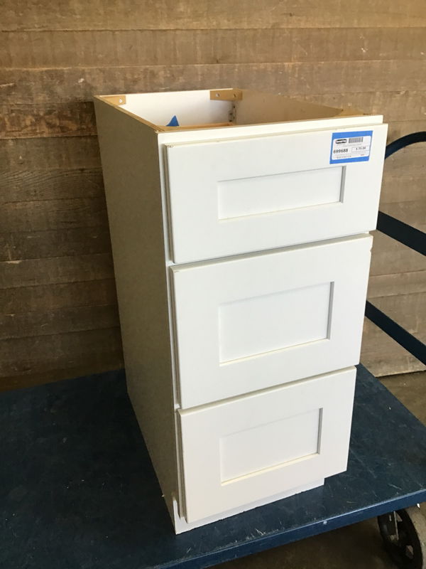Three drawer base kitchen cabinet in good, lightly used condition. Made with a nice plywood box, and the drawers have dovetail joins and shaker style faces. Bottom drawer is sticking a little and needs to fiddled with to unstick. May have some minor cosmetic damage.
