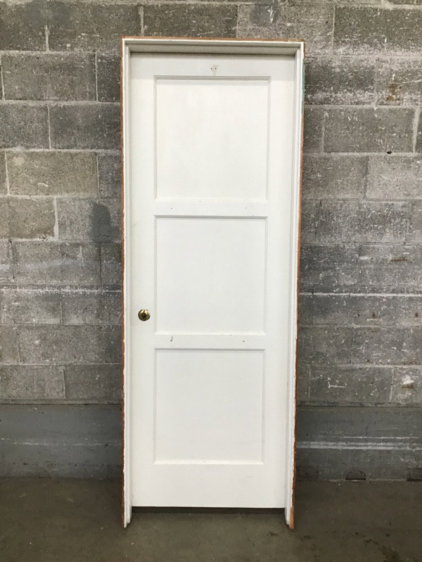 Nice 28" 3-panel door in jamb with a cute vintage brass handle. A couple layers of paint but it's in good shape overall!