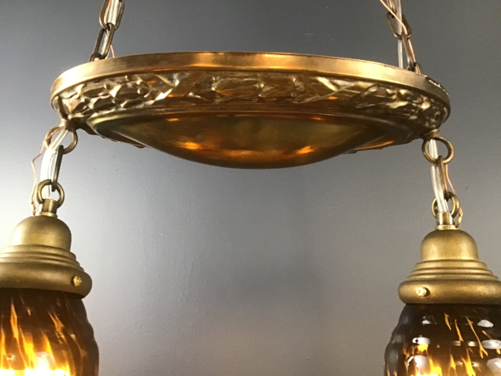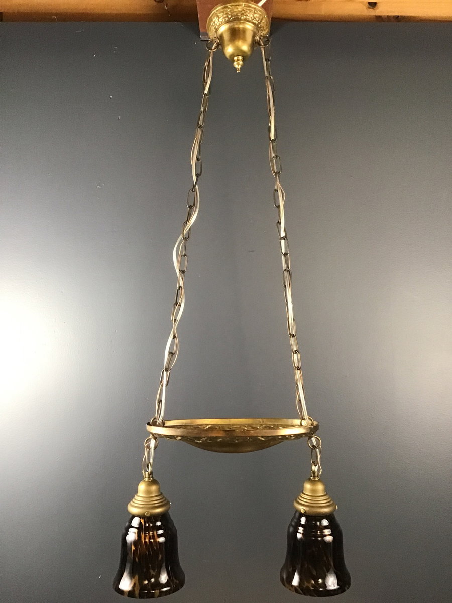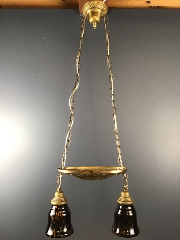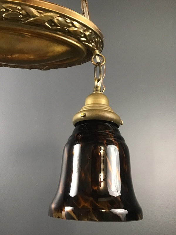 This double shade shower light from the 1920s has been rewired in house, and paired with vintage art glass tortoise shell shades (2.5" fitter) from our collection. This fixture is part of our art glass collection in the Royal Hunter showroom.