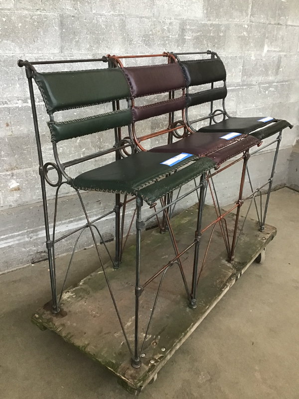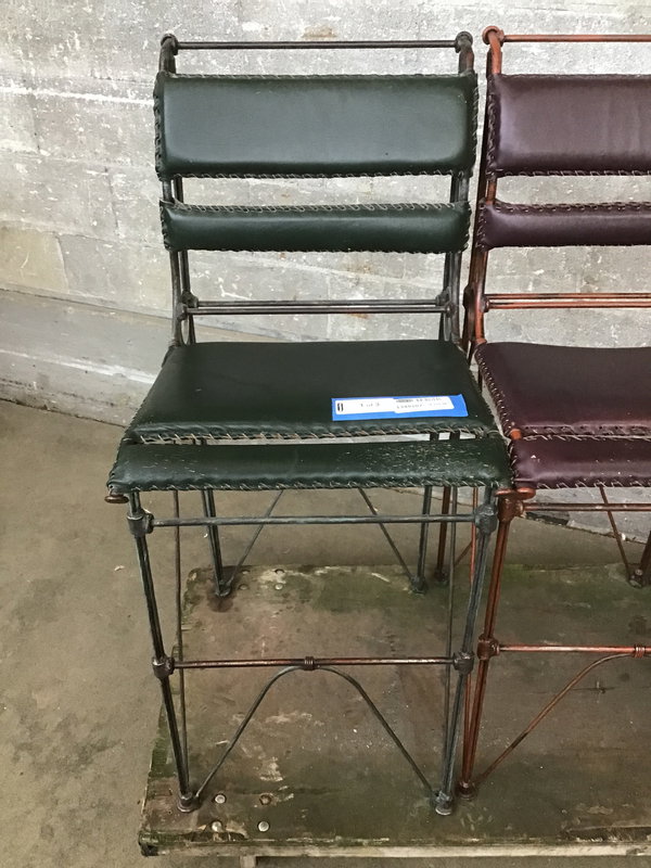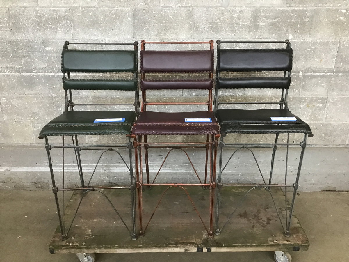 Leather and steel, tricolor barstool thruple that had some extended scratching post relationship with a cat or cats which is mainly seen on the edge of each seat. The damage is surface and you could likely condition these get them to more of a 'distressed' vibe than 'what happened here?' This structurally sound set is sold as a trio.