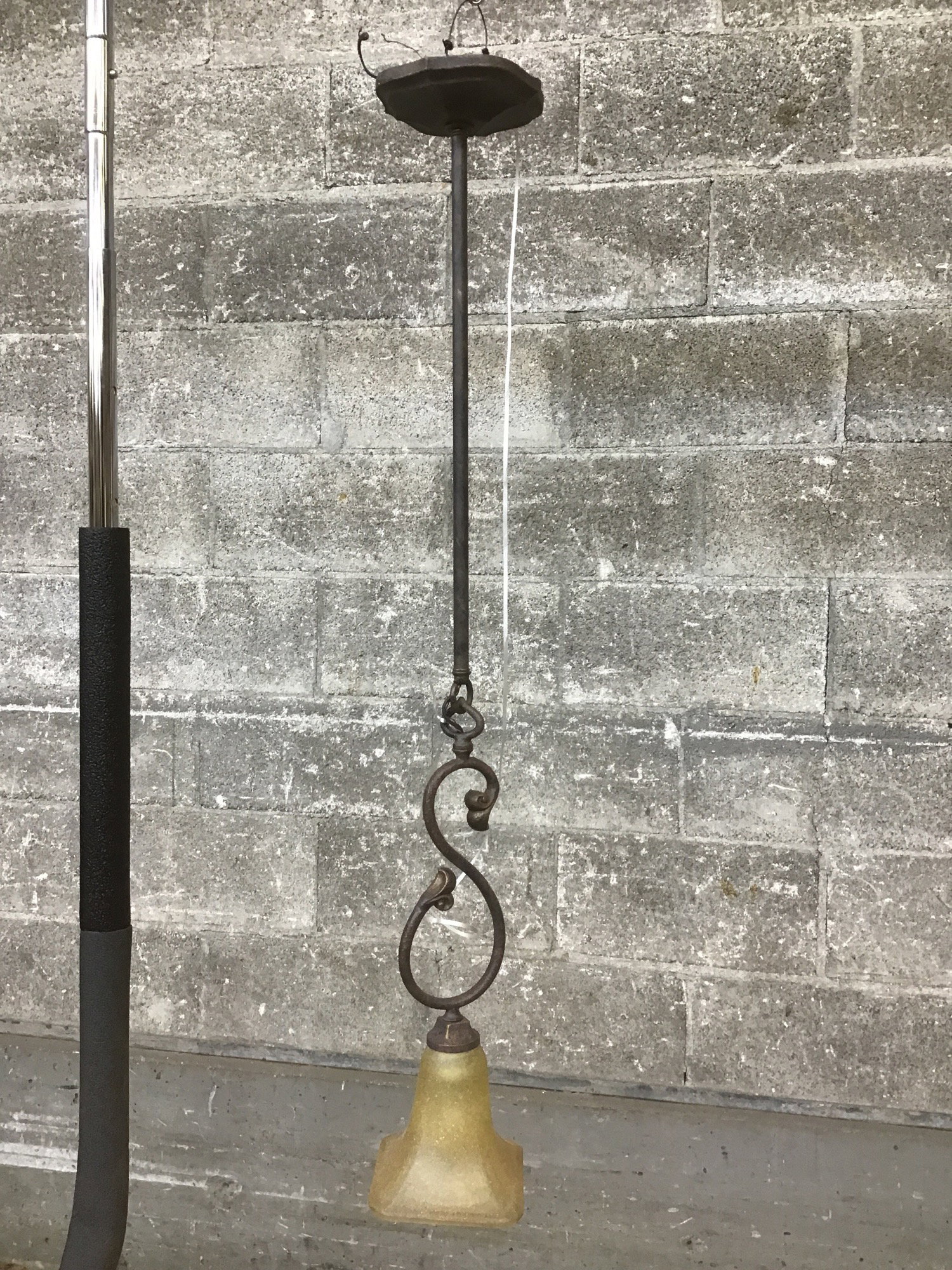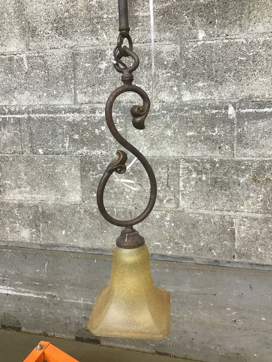 Tuscan revival style pendant light with frosted and tinted glass and a faux distressed brass finish.