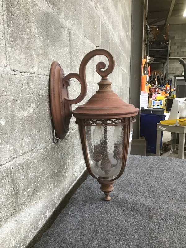 This is a Tuscan Revival style lantern sconce with a weathered coppery finish and bubble glass.