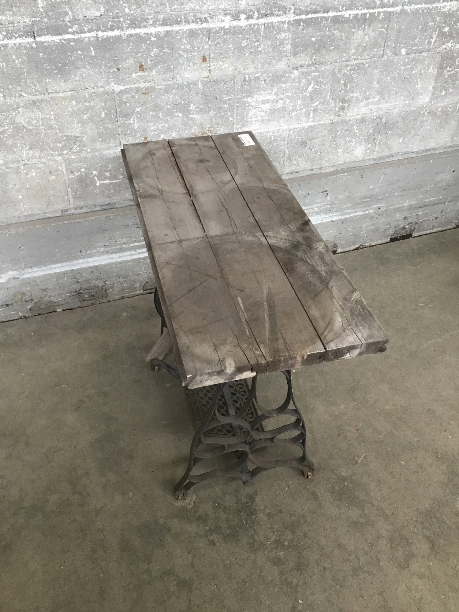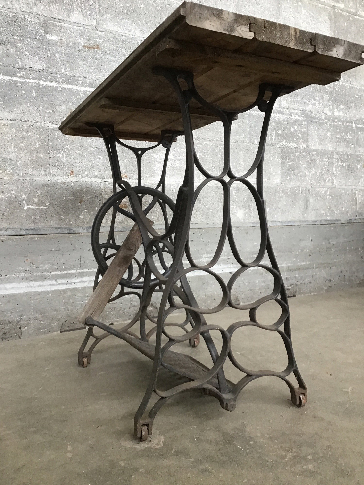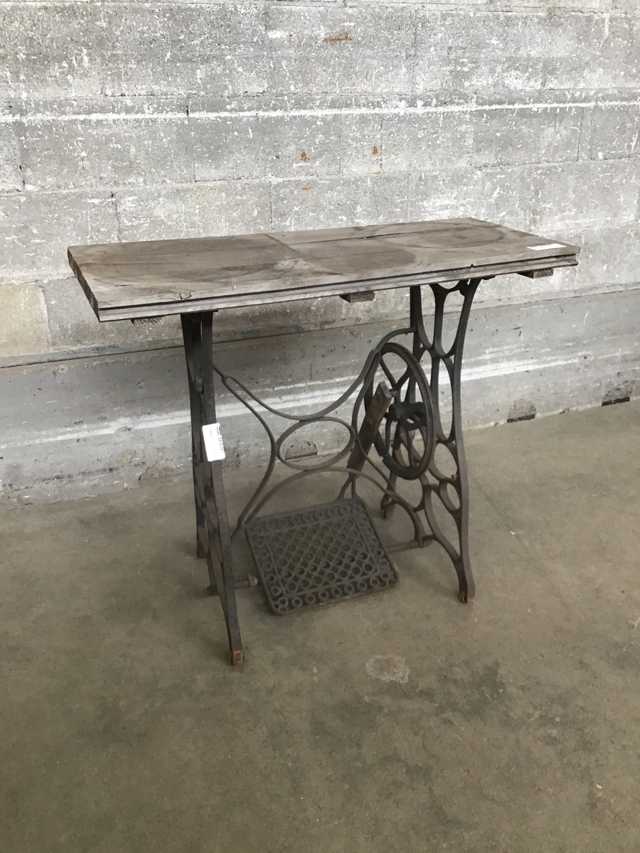 Antique sewing machine steel base with a thick wood top made out of old car decking boards. This thing is ready to live its best life in your garden as a potting bench right now! Or you can toss on a nicer wood top for a sweet side table. Listed measurements include the top. The base solo is 22"w x 16.5d x 28.75" tall. The bottom foot wheel does rotate, though it's a bit sticky.