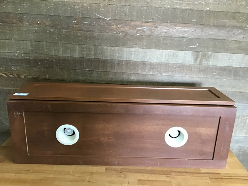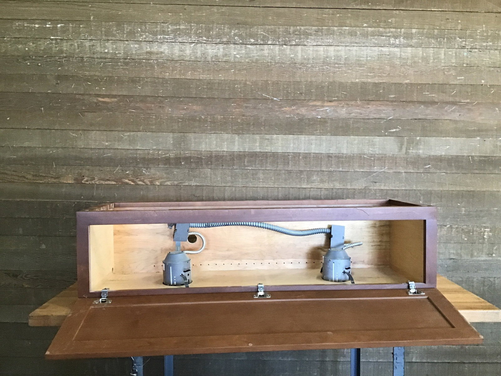 Upper cabinet set up as a downlight with two installed recessed lights on the side.