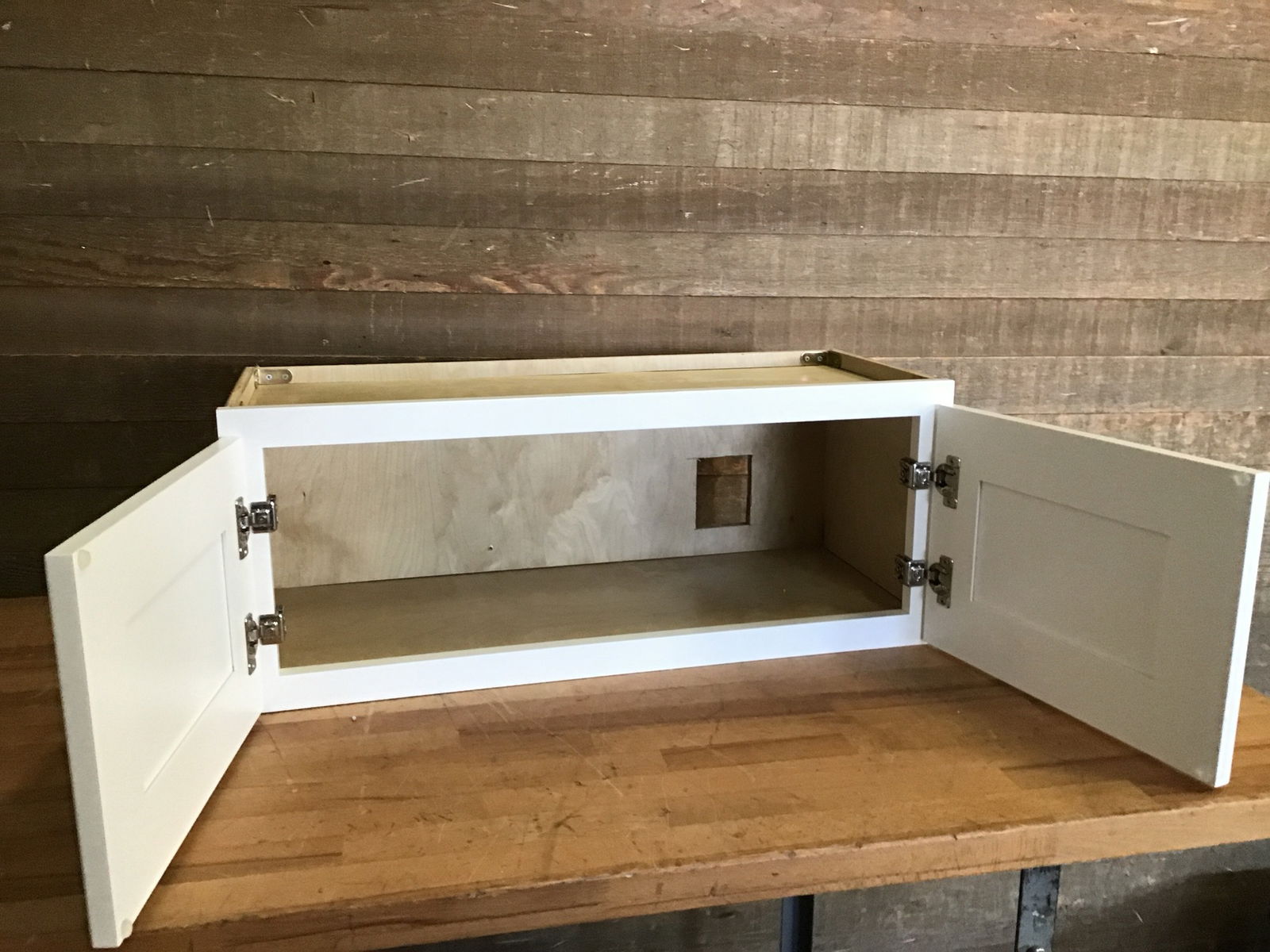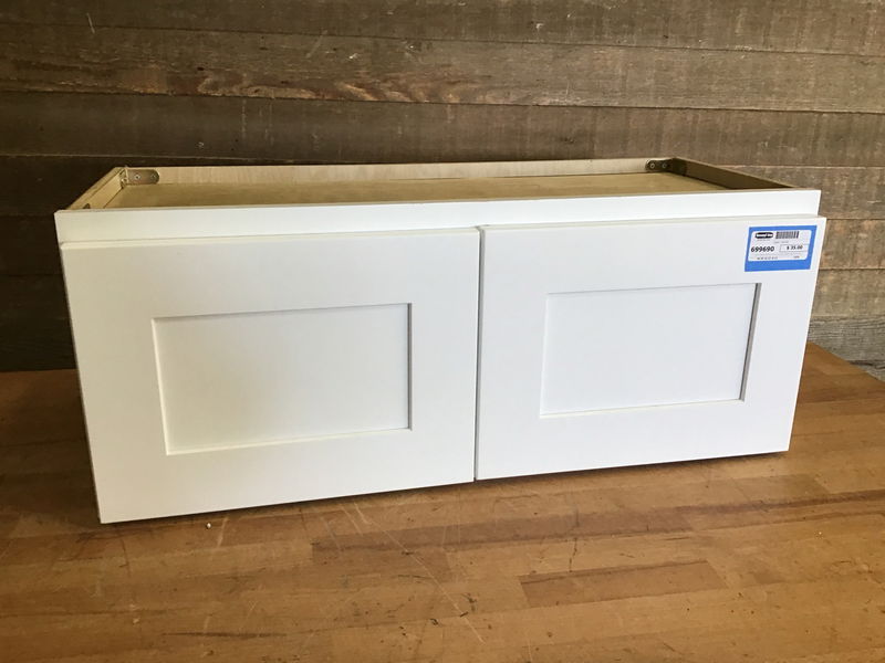 Small upper kitchen cabinet in good, lightly used condition. Has a cutout in the back for cords. Doors have shaker style faces and soft close hardware. May have minor cosmetic damage.