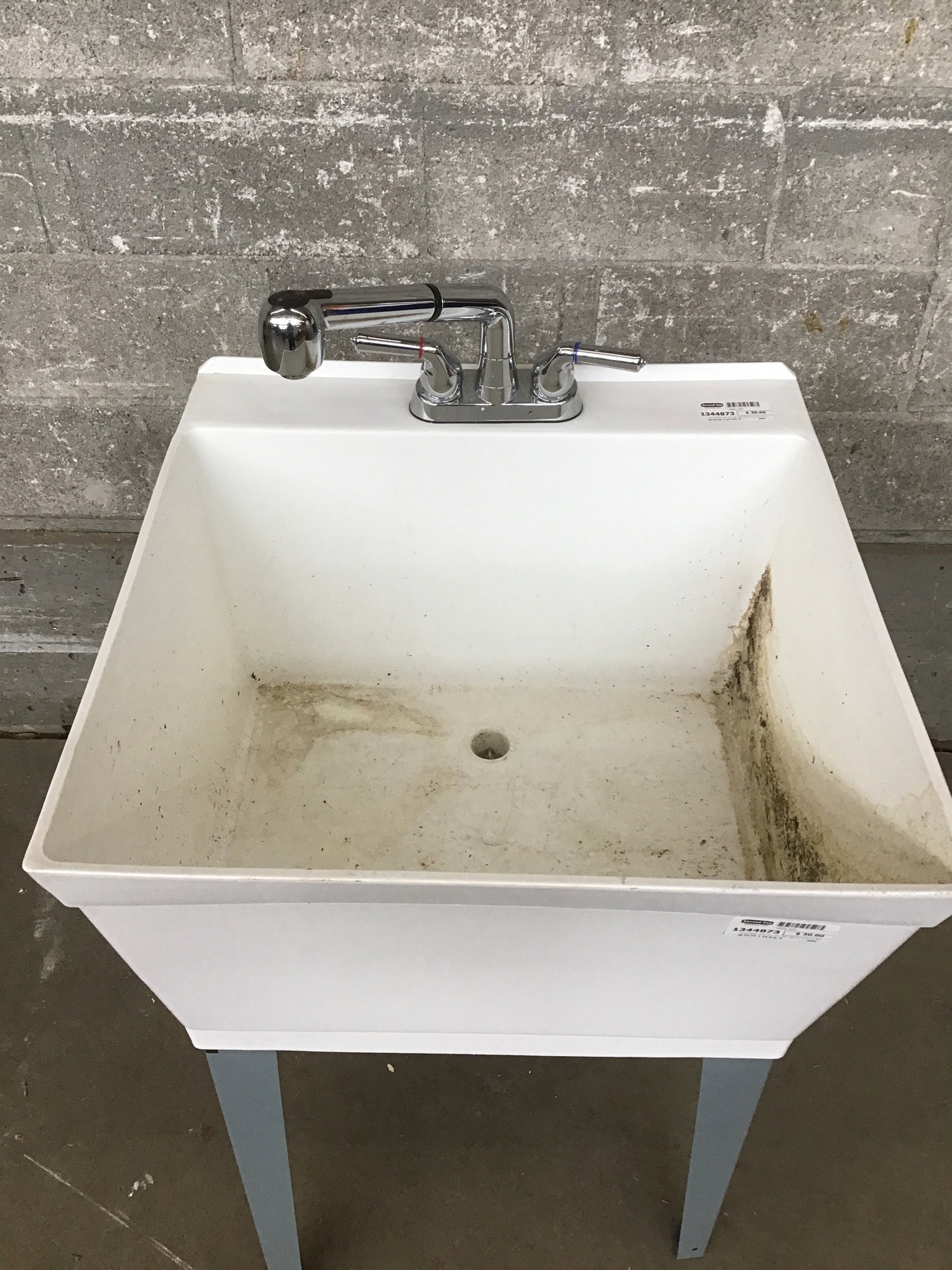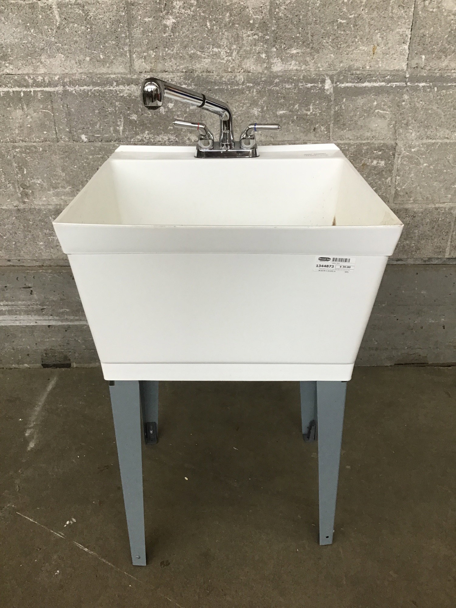 White plastic utility sink with steel legs and a chrome faucet with pull out sprayer.